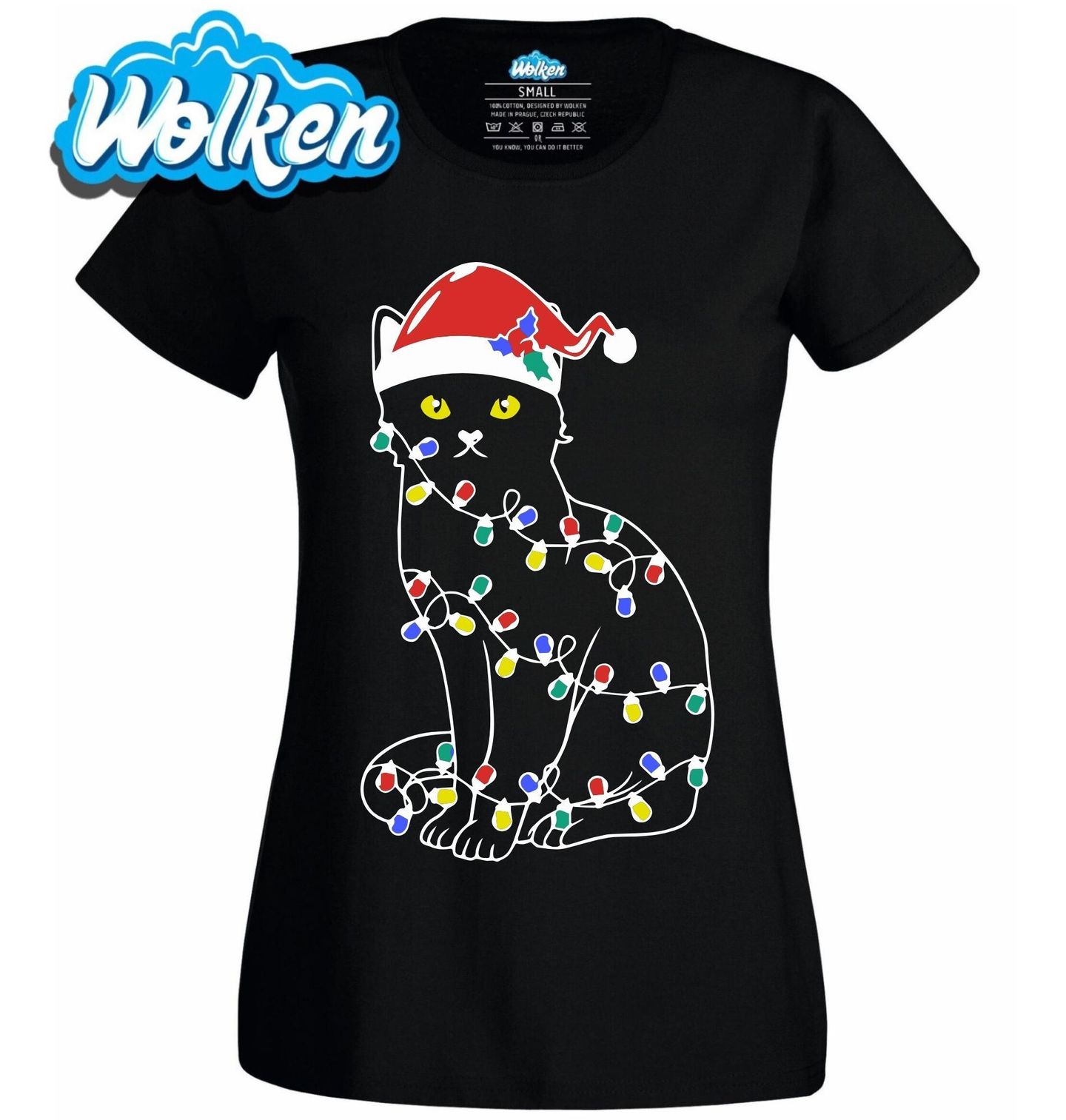 Dámské tričko Santova Kočka. Vánoce jsou tady a s nimi i jedinečný motiv, který potěší každého milovníka koček. Stylová kočka s čepicí Santa Clause a omotaná barevnými světýlky přináší hravý a roztomilý design, který zpestří sváteční období.