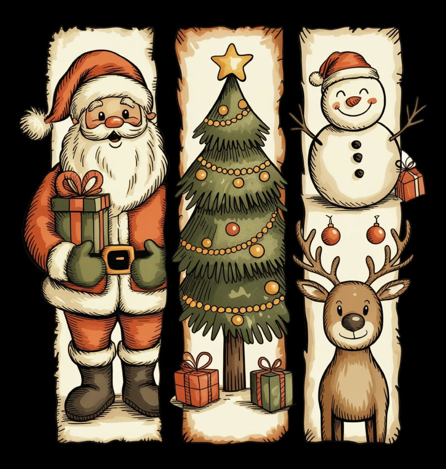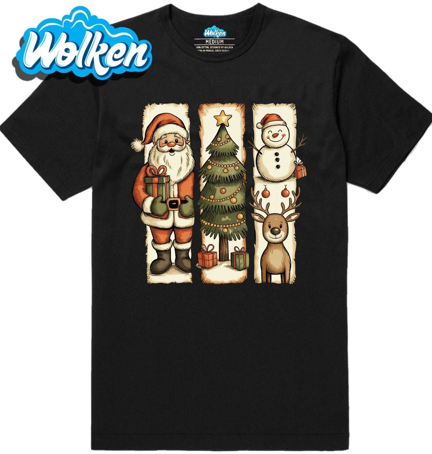 Pánské tričko Santova Parta. Tento roztomilý Vánoční polyptych spojuje čtyři klasické motivy – santa, sněhulák, vánoční stromeček a jelen – do jedinečné kompozice, která doslova dýchá kouzlem Vánoc. Připomene to nejlepší, co Vánoce nabízí.