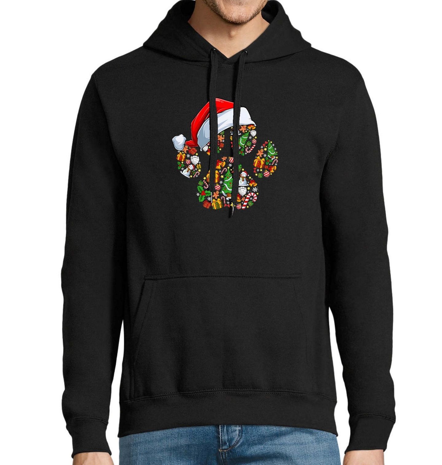 Pánská mikina Santova Psí Tlapka. Když se blíží Vánoce, neměli by zůstat pozadu ani čtyřnozí parťáci! Tento roztomilý potisk ve tvaru tlapky, poskládaný z dárků, stromečků, perníčků a dalších svátečních ikon, potěší každého, kdo miluje psa, je hrdý pejskař a chce, aby tlapky byly součástí sváteční nálady.