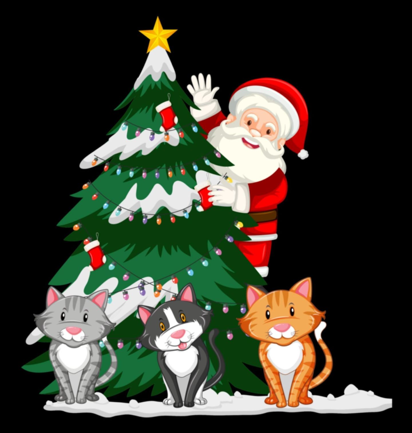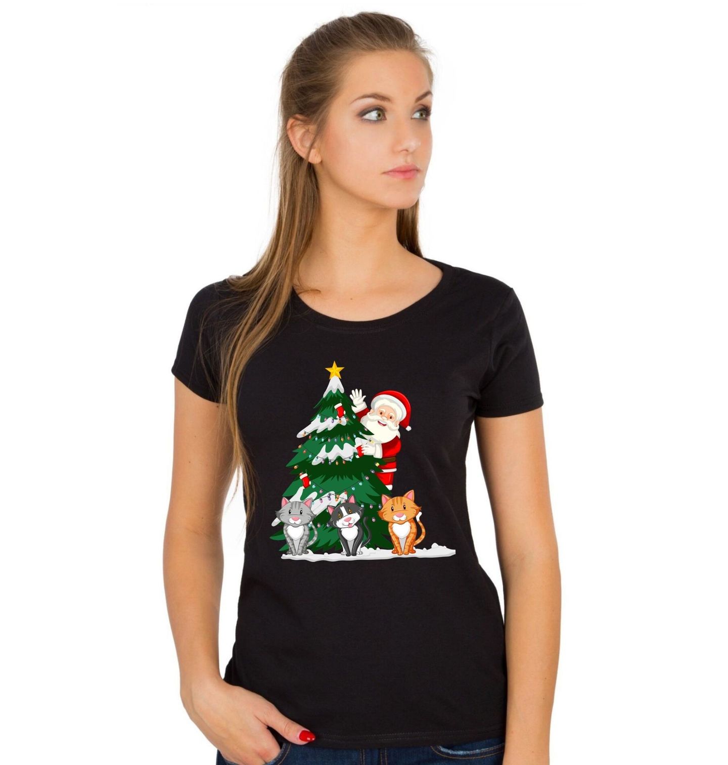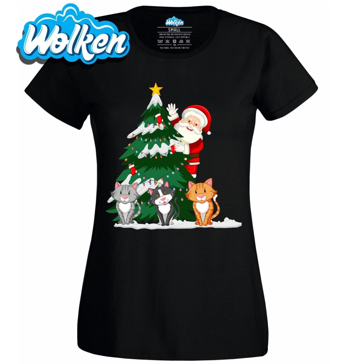 Dámské tričko Santovy Kočky u Stromečku. Roztomilý motiv, který spojuje Vánoce, Santu a kočky v jedinečné sváteční scéně. Santa Claus vykukuje za vánočním stromkem ozdobeným světýlky a třemi veselými kočkami, které mu dělají společnost. Tento motiv je ideální pro každého milovníka Vánoc a zvířat, kteří chtějí dodat svému outfitu nebo dárku hravý a veselý nádech.