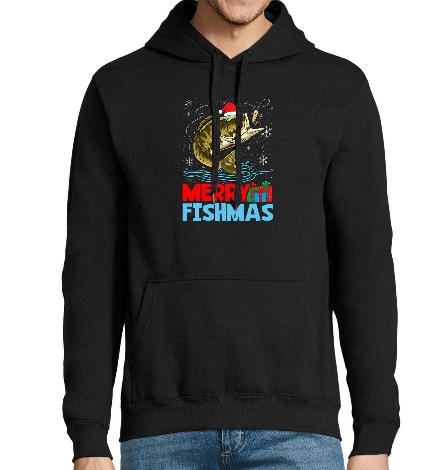 Pánská mikina Santův Okoun na Háčku. Připravte se na sváteční zábavu s motivem Merry Fishmas, který potěší každého rybáře i milovníka originálních vánočních designů. Tento veselý motiv zachycuje rybu – okouna, který skáče z vody s vánoční čepicí na hlavě, připravený na pořádné rybaření i během Vánoc.