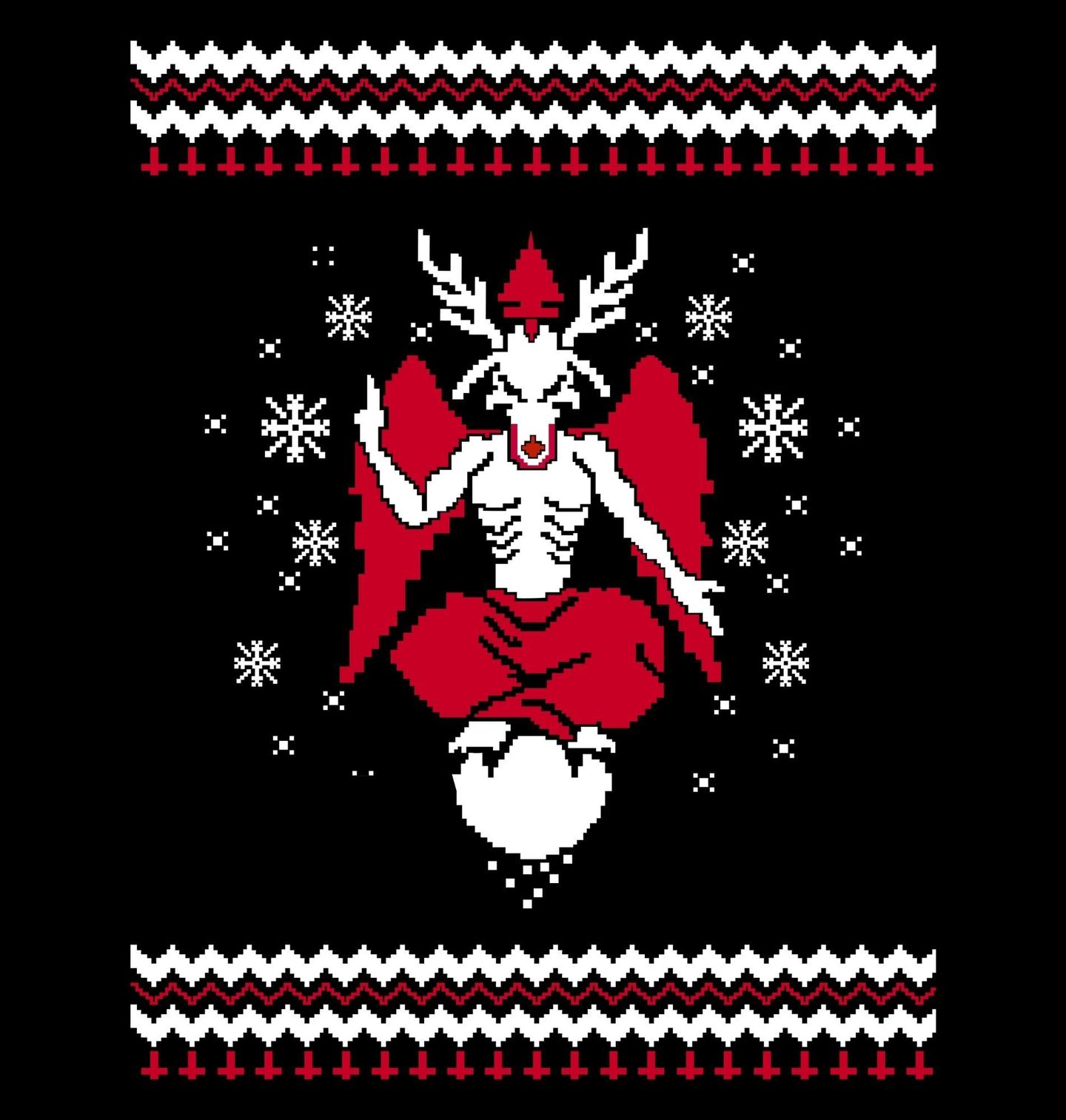 Pánské tričko Satanské Vánoce s Bafometem. Objevte Vánoce v úplně novém světle s tímto originálním ugly sweaterem, který rozhodně není pro slabé povahy! Design kombinuje tradiční vánoční prvky se siluetou Baphometa - symbol používaný v okultismu, často zobrazovaný jako démon s kozlí hlavou, křídly a rohy, tentokrát je ale ve vánoční čepici s jeleními parohy.