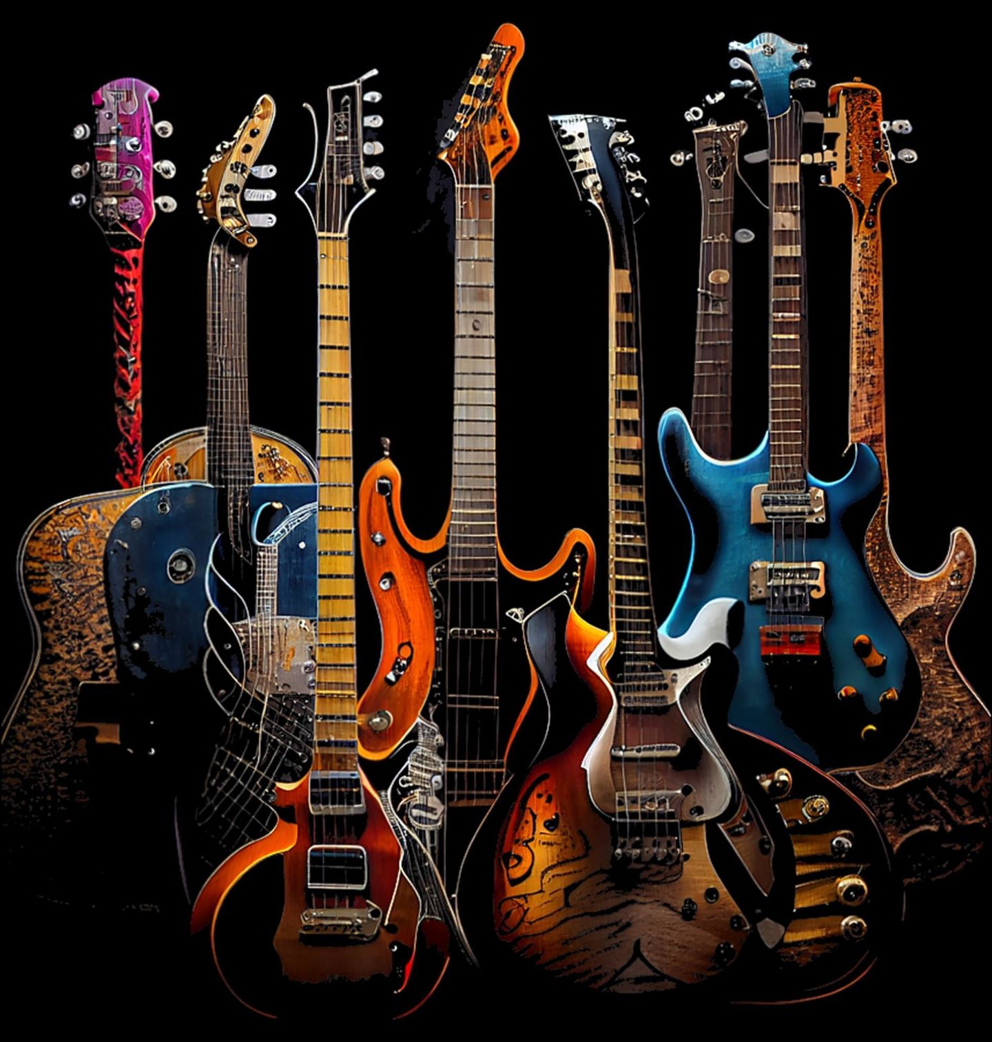 Pánská mikina Sbírka Rockových Kytar. Design zobrazuje několik různých typů elektrických nástrojů postavených vedle sebe – od klasických tvarů až po moderní modely s výraznými barvami a detaily. Každá kytara má svůj charakter, jiný tvar těla, hlavici i snímače, což vytváří působivou „sbírku“ hudebních ikon na jednom místě. Skvěle se hodí pro hudebníky, sběratele nástrojů, fanoušky koncertů i pro ty, kteří chtějí ukázat svou vášeň pro strunný svět.