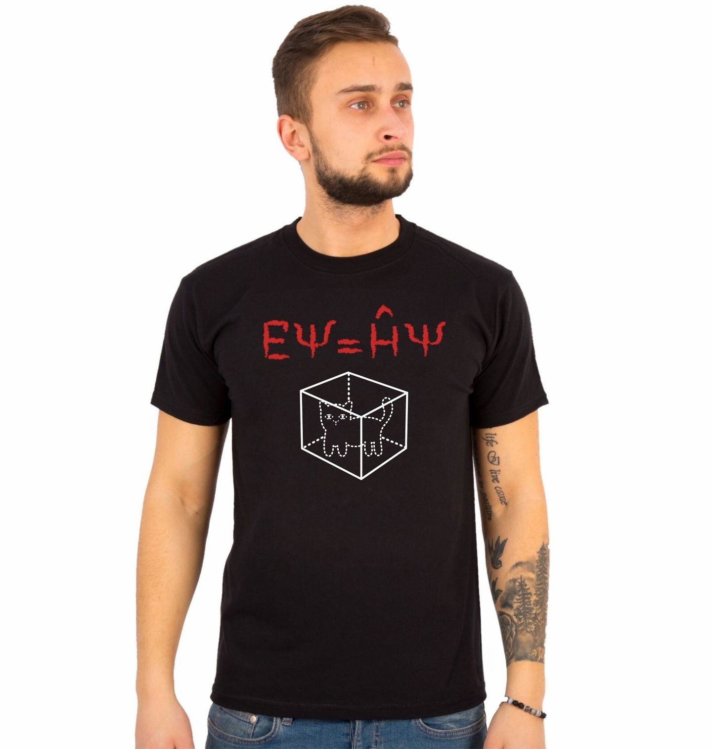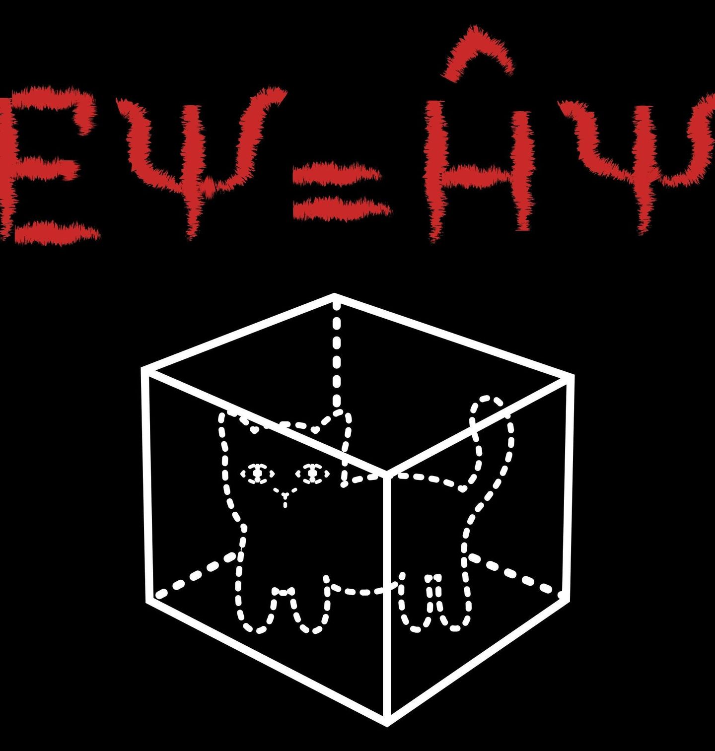 Pánské tričko Schrödingerova Kočka v Krabici. Originální a vtipný motiv inspirovaný slavnou myšlenkou z fyziky – Schrödingerova kočka, která je současně „živá i mrtvá“. Nápis EΨ = ĤΨ vychází z kvantové mechaniky a představuje symbolickou rovnici vlnové funkce, která popisuje stav částic. Právě tyto znaky dodávají designu jedinečný vědecký nádech a dělají z něj chytrou parodie s hlubším významem.