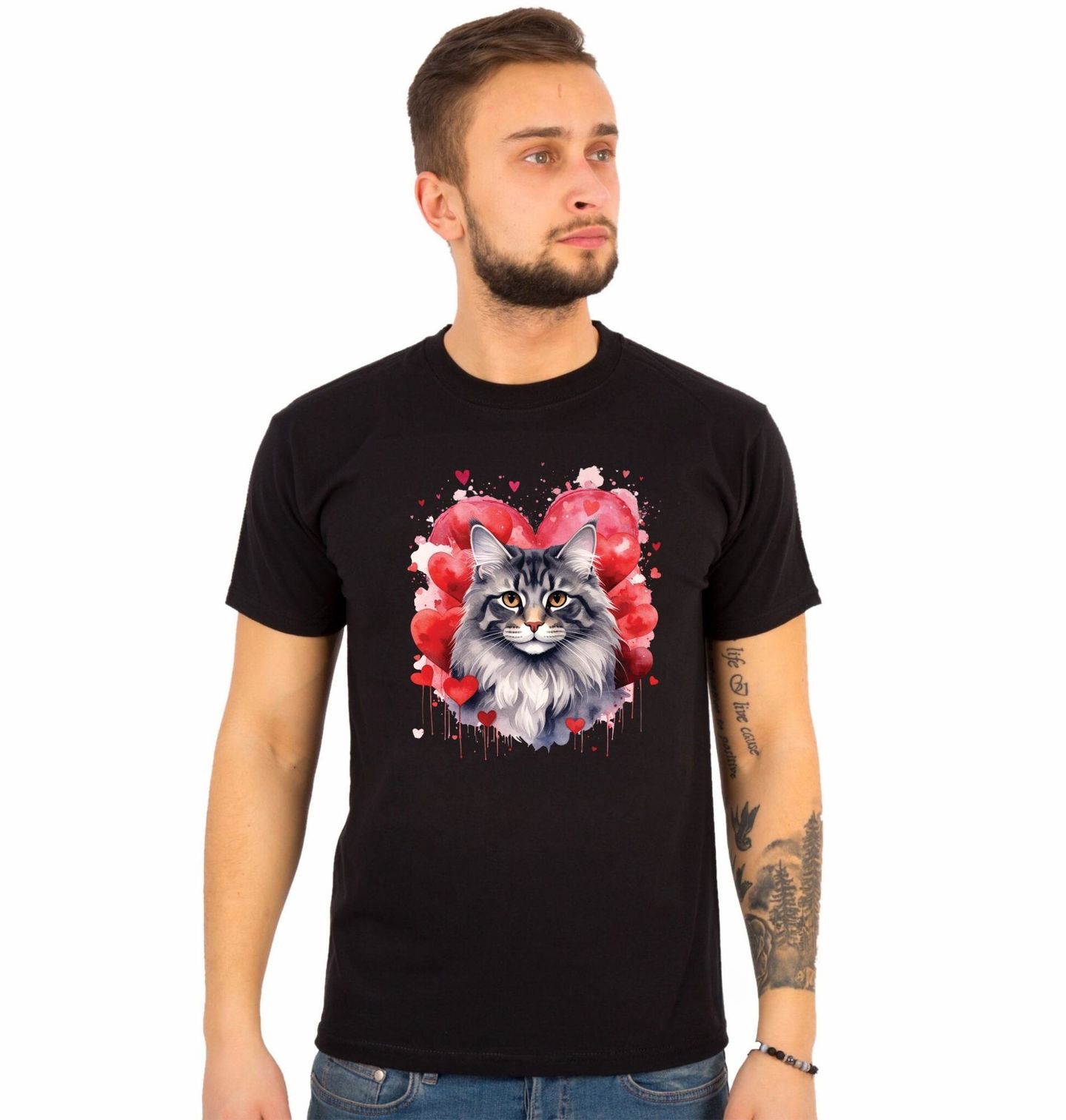 Pánské tričko Šedá Kočka mezi Srdci. Tento romantický motiv zobrazuje kočka v jemném akvarelovém stylu, obklopenou červenými srdci, které symbolizují lásku, něhu a klid. Ilustrace zachycuje stylizovanou dlouhosrstou kočka s výraznýma očima a hebkou srstí, bez určení konkrétní rasy.