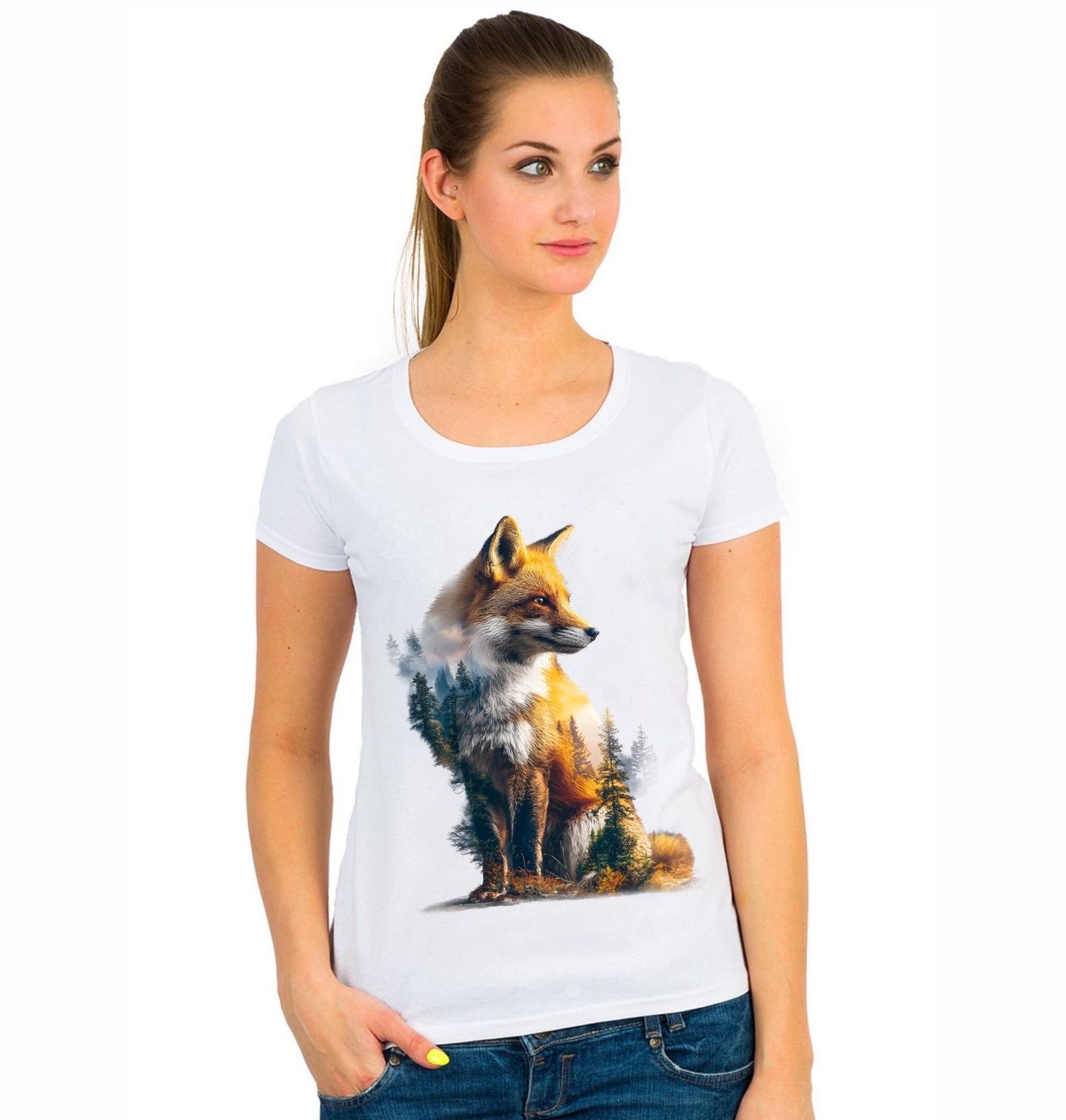 Dámské tričko Sedící Liška v Krajině. Elegantní motiv zachycuje sedící lišku v dokonalém spojení s přírodou, kde se prolíná klidná krajina a husté stromy. Tento design vyzařuje harmonii, jemnost i sílu divočiny a osloví každého, kdo miluje přírodu, zvířata a atmosféru lesní krajiny.