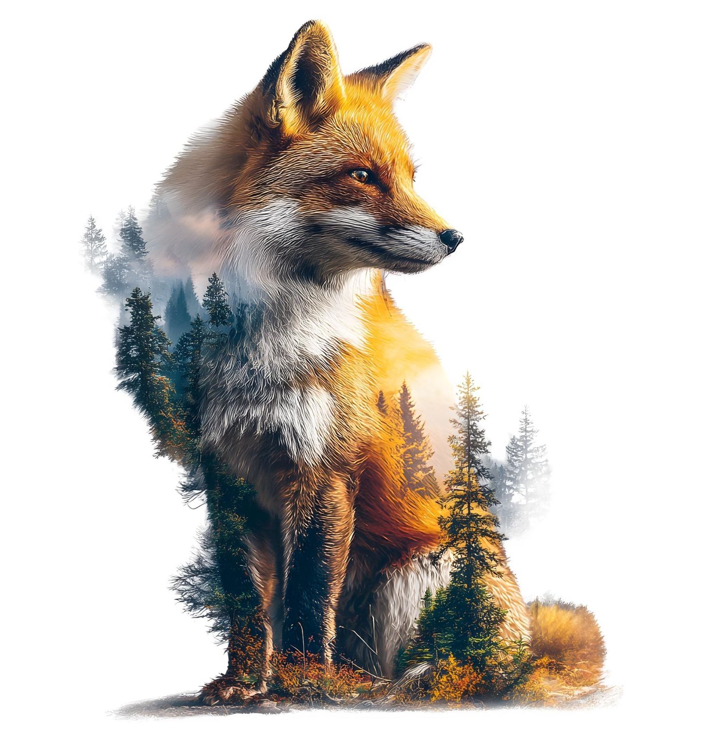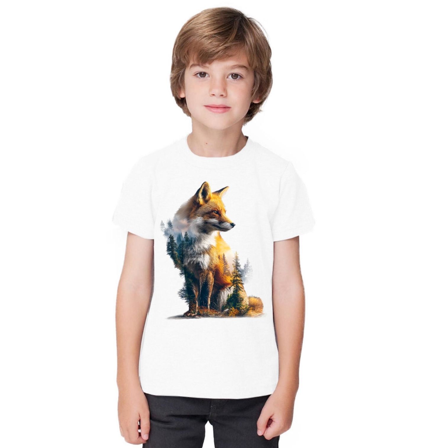 Dětské tričko Sedící Liška v Krajině. Elegantní motiv zachycuje sedící lišku v dokonalém spojení s přírodou, kde se prolíná klidná krajina a husté stromy. Tento design vyzařuje harmonii, jemnost i sílu divočiny a osloví každého, kdo miluje přírodu, zvířata a atmosféru lesní krajiny.