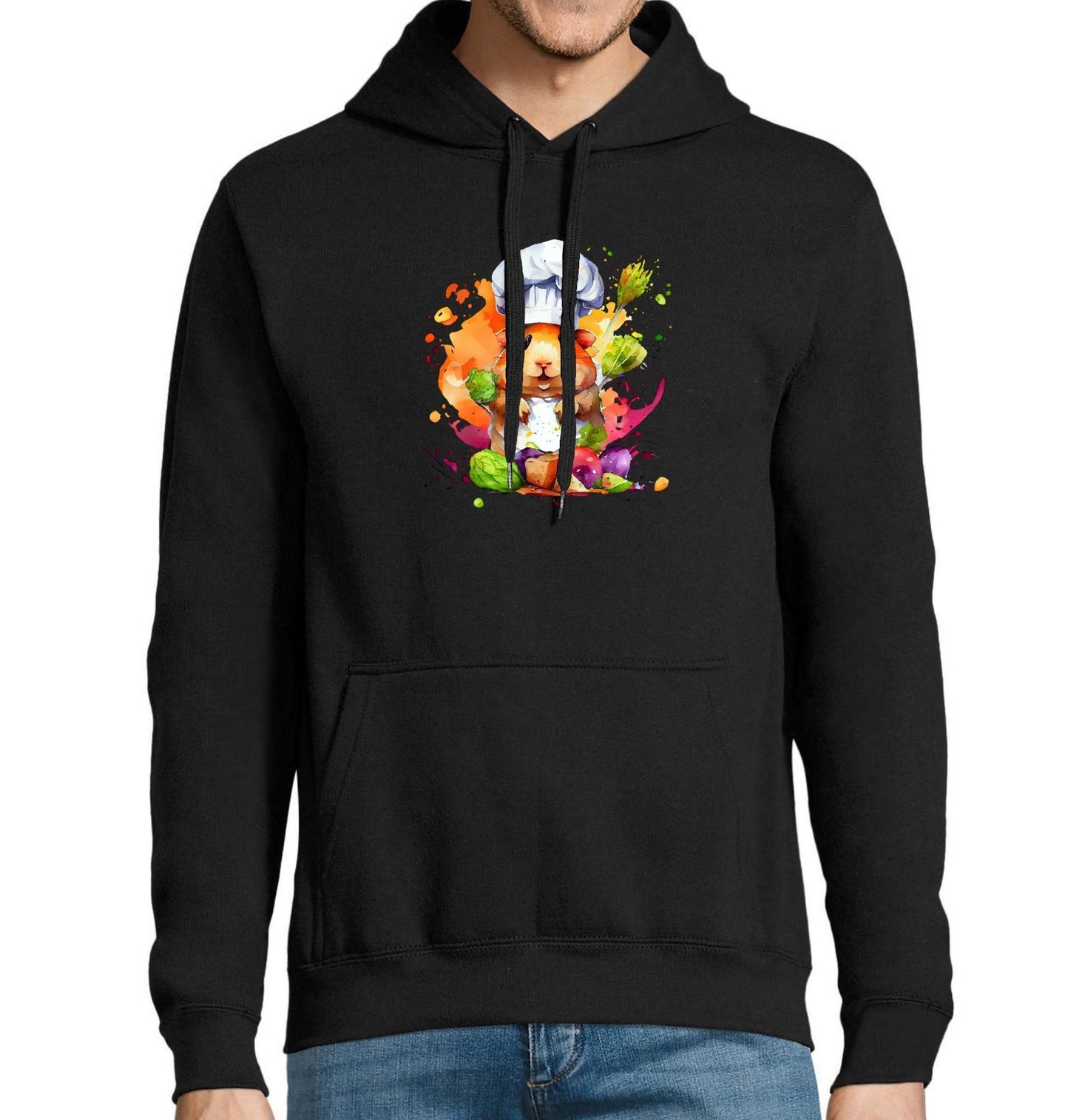 Pánská mikina Šéfkuchař Morče. Originální motiv, který spojuje roztomilost a kulinářské umění! Akvarelový obrázek, kde hlodavec v kuchařské čepici a zástěře drží zeleninu a je obklopeno barevnými ingrediencemi, je ideální pro všechny milovníky vaření i zvířátek.