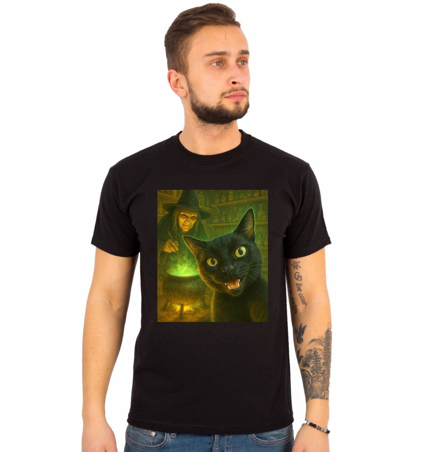 Pánské tričko Selfie Černy Kočky a Čarodějnice. Motiv černé kočky a čarodějnici míchající záhadný lektvar v temné místnosti plné magie. Atmosféra je plná napětí, zelené světlo z kotlíku osvětluje scénu a vytváří magický, lehce děsivý dojem. Tento motiv spojuje mystiku, fantazii a sílu starých kouzel, kde kočka hraje roli tichého pozorovatele i možného pomocníka.