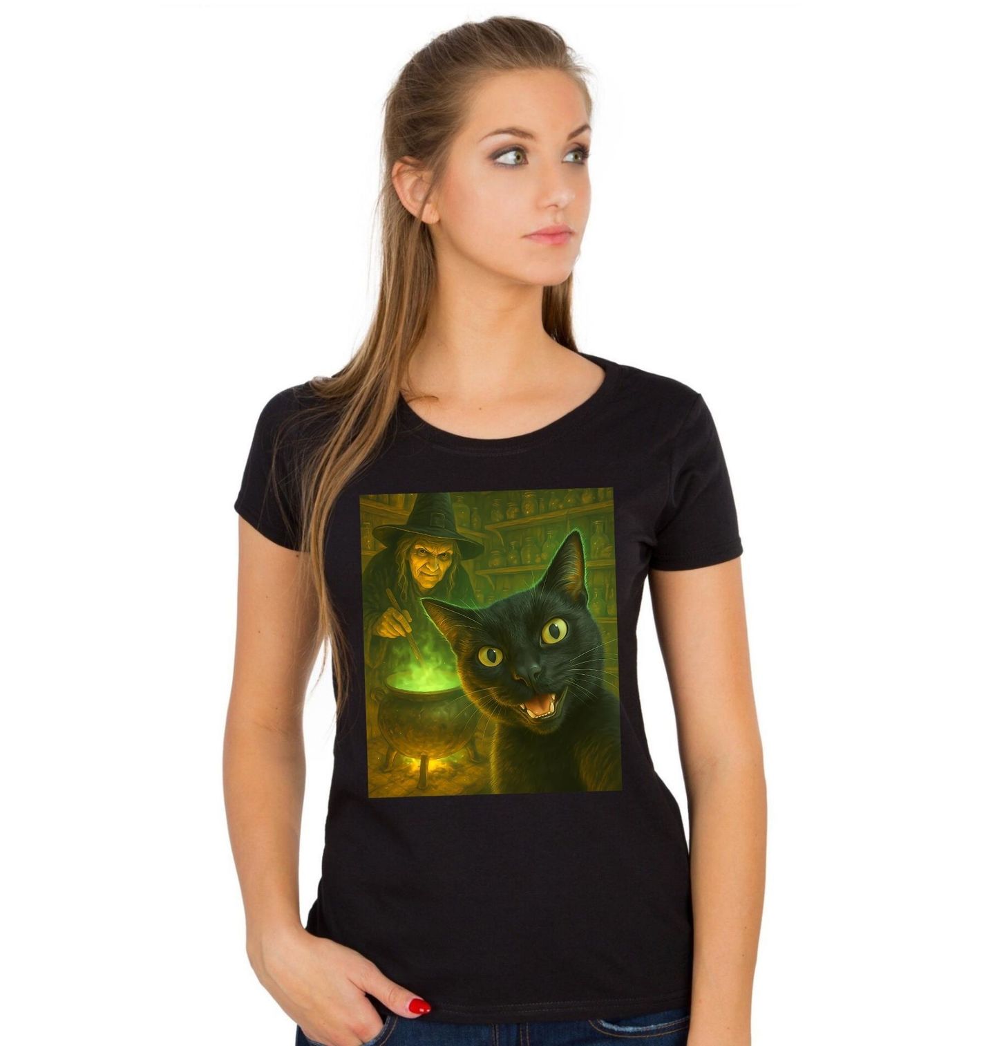 Dámské tričko Selfie Černy Kočky a Čarodějnice. Motiv černé kočky a čarodějnici míchající záhadný lektvar v temné místnosti plné magie. Atmosféra je plná napětí, zelené světlo z kotlíku osvětluje scénu a vytváří magický, lehce děsivý dojem. Tento motiv spojuje mystiku, fantazii a sílu starých kouzel, kde kočka hraje roli tichého pozorovatele i možného pomocníka.