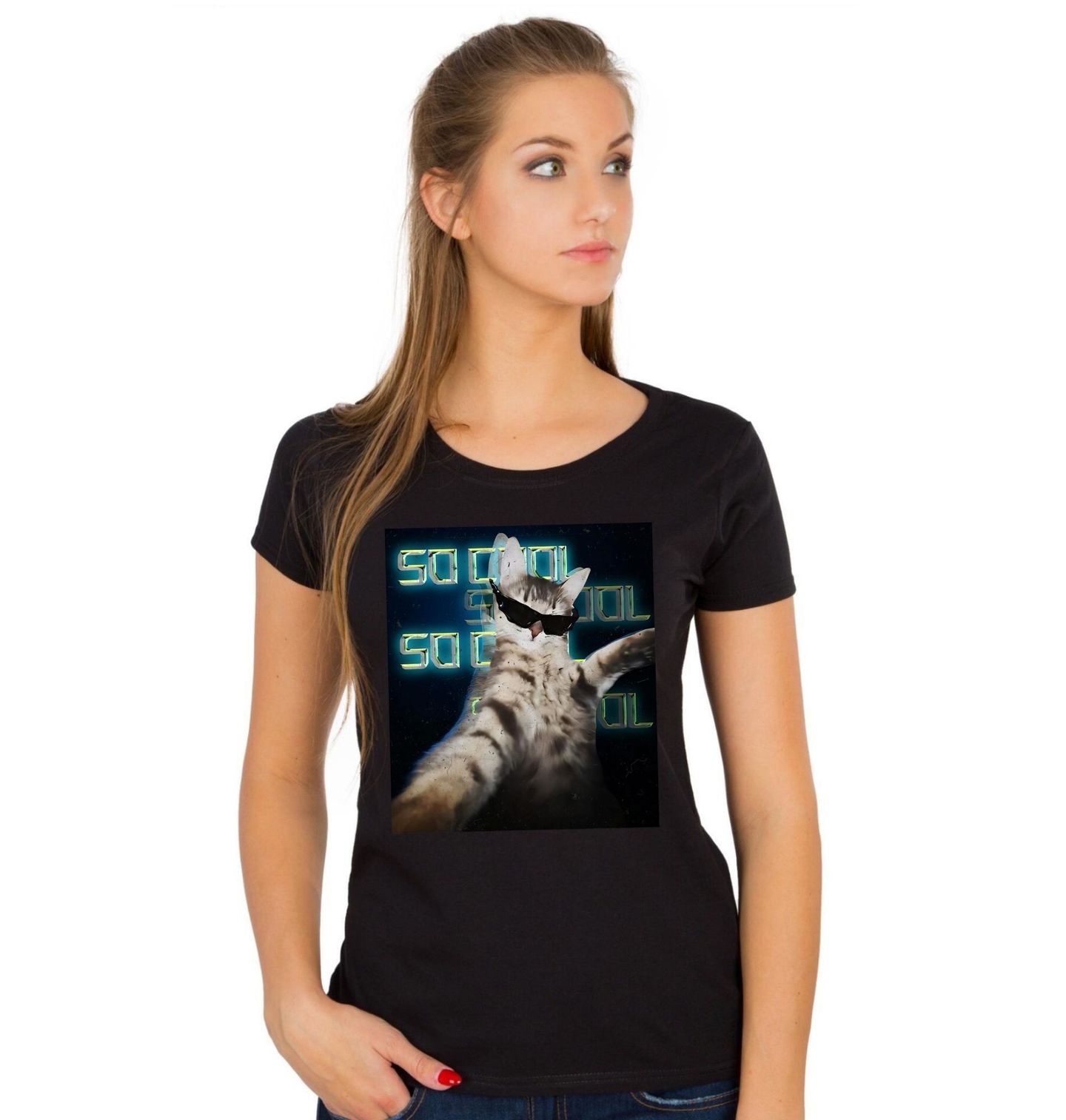 Dámské tričko Selfie Cool Kočka s Brýlemi. Kočka v brýlích při selfie ukazuje svůj styl a sebevědomí. Nápis „SO COOL“ znamená „Tak cool“, což perfektně vystihuje její výraz i pózu. Ideální motiv pro všechny, kdo milují vtipné obrázky a kočky.