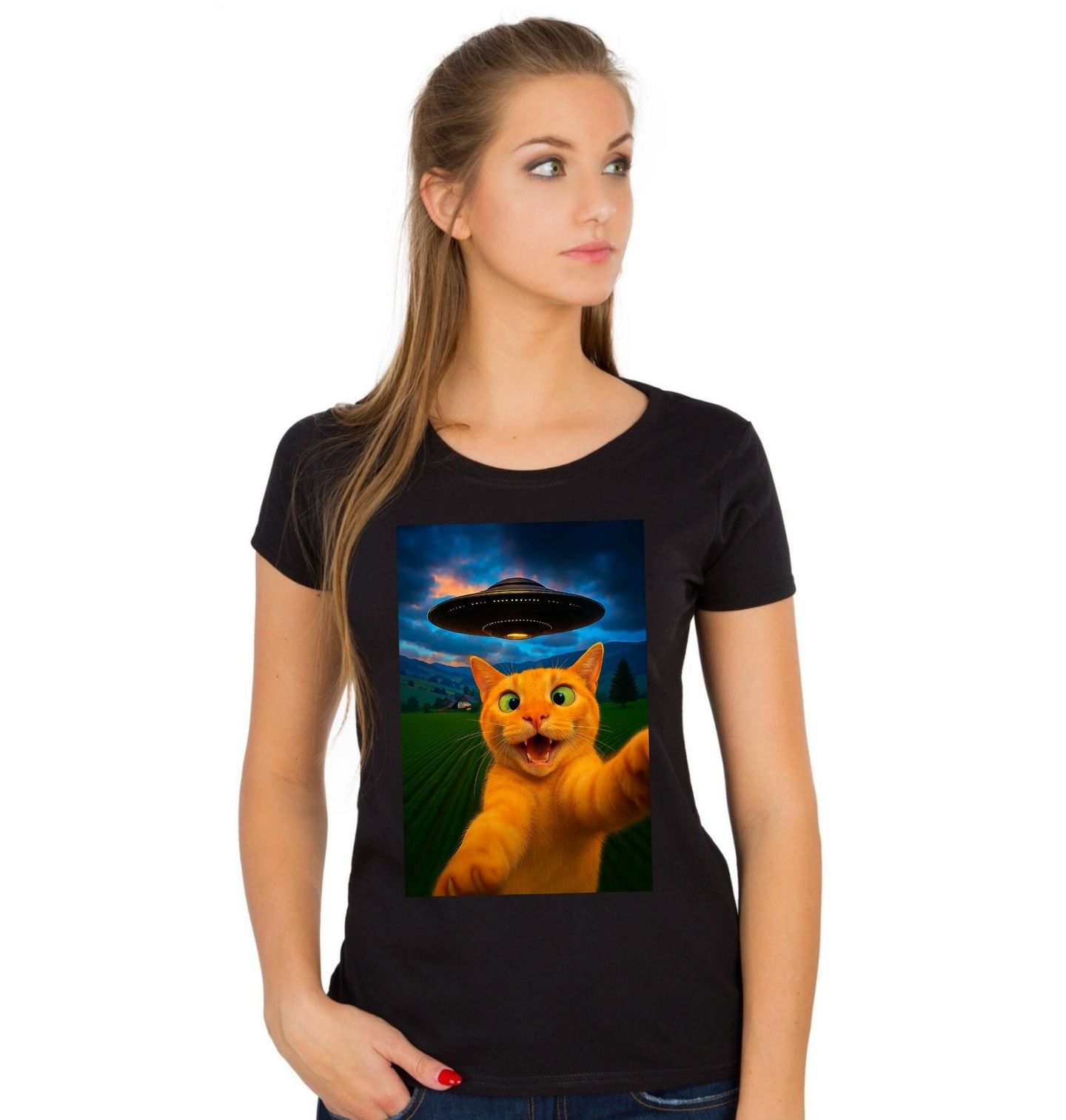 Dámské tričko Selfie Kočky a UFO. Zvědavá kočka si pořizuje selfie ve chvíli, kdy nad ní visí záhadné UFO na večerní obloze. Scéna působí hravě i tajemně zároveň, jako by kočka byla svědkem mimozemského kontaktu. Tento motiv spojuje humor, sci-fi a dobrodružství, kde kočka stojí v centru nečekané události.