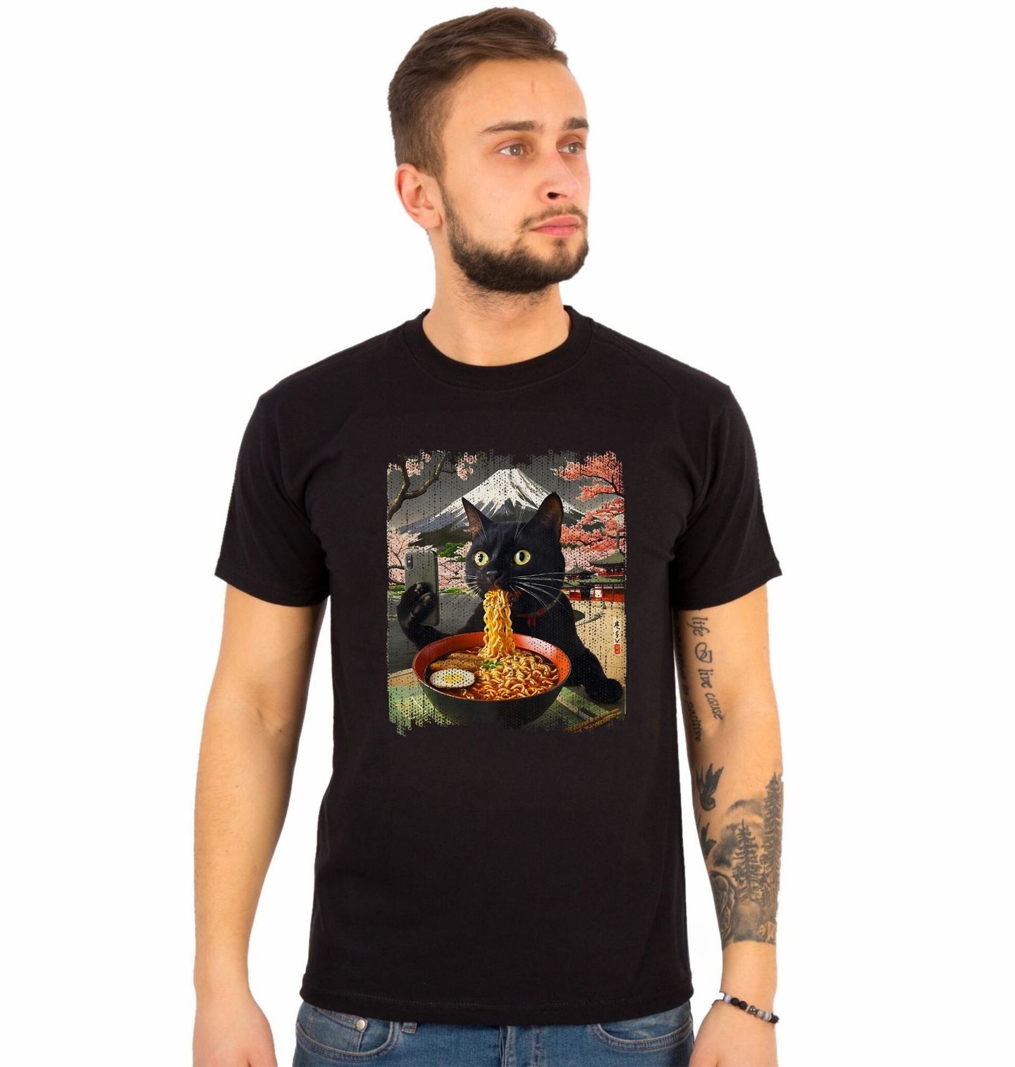 Pánské tričko Selfie Kočky s Ramenem. Stylová černá kočka zachycena při focení selfie, zatímco si vychutnává misku pálivého ramenu, s ikonickou horou Fudži a kvetoucí sakurou v pozadí. Tento motiv v sobě dokonale spojuje humor, moderní trendy i tradiční Japonsko.
