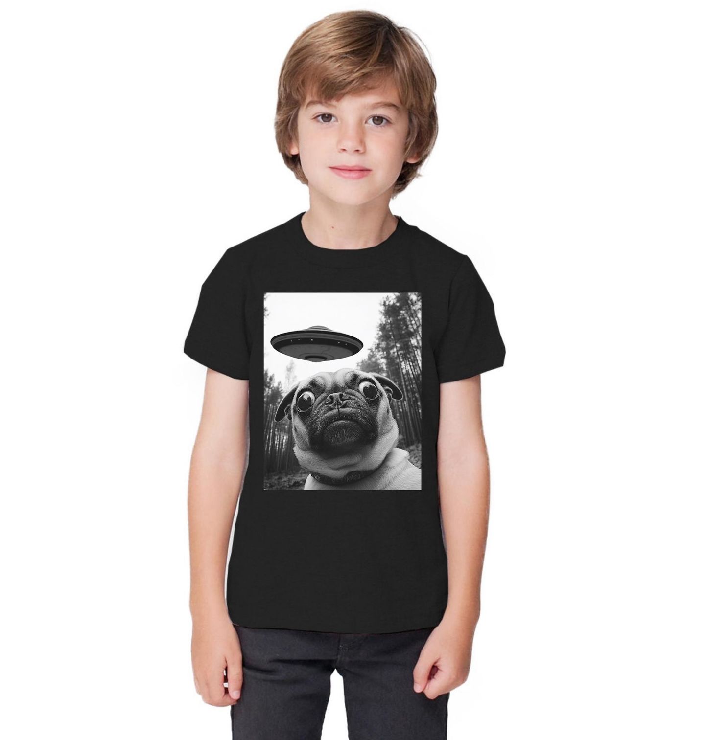 Dětské tričko Selfie Mopse a UFO. Zvědavý pes plemene mops se ocitá uprostřed nečekaného setkání s UFO, což vytváří vtipný a zároveň tajemný motiv. Velké oči a výraz mopsí zvědavosti dokonale ladí s absurdní situací v lesním prostředí. Tento design spojuje humor, sci-fi a lásku ke psům do jednoho originálního vizuálu.