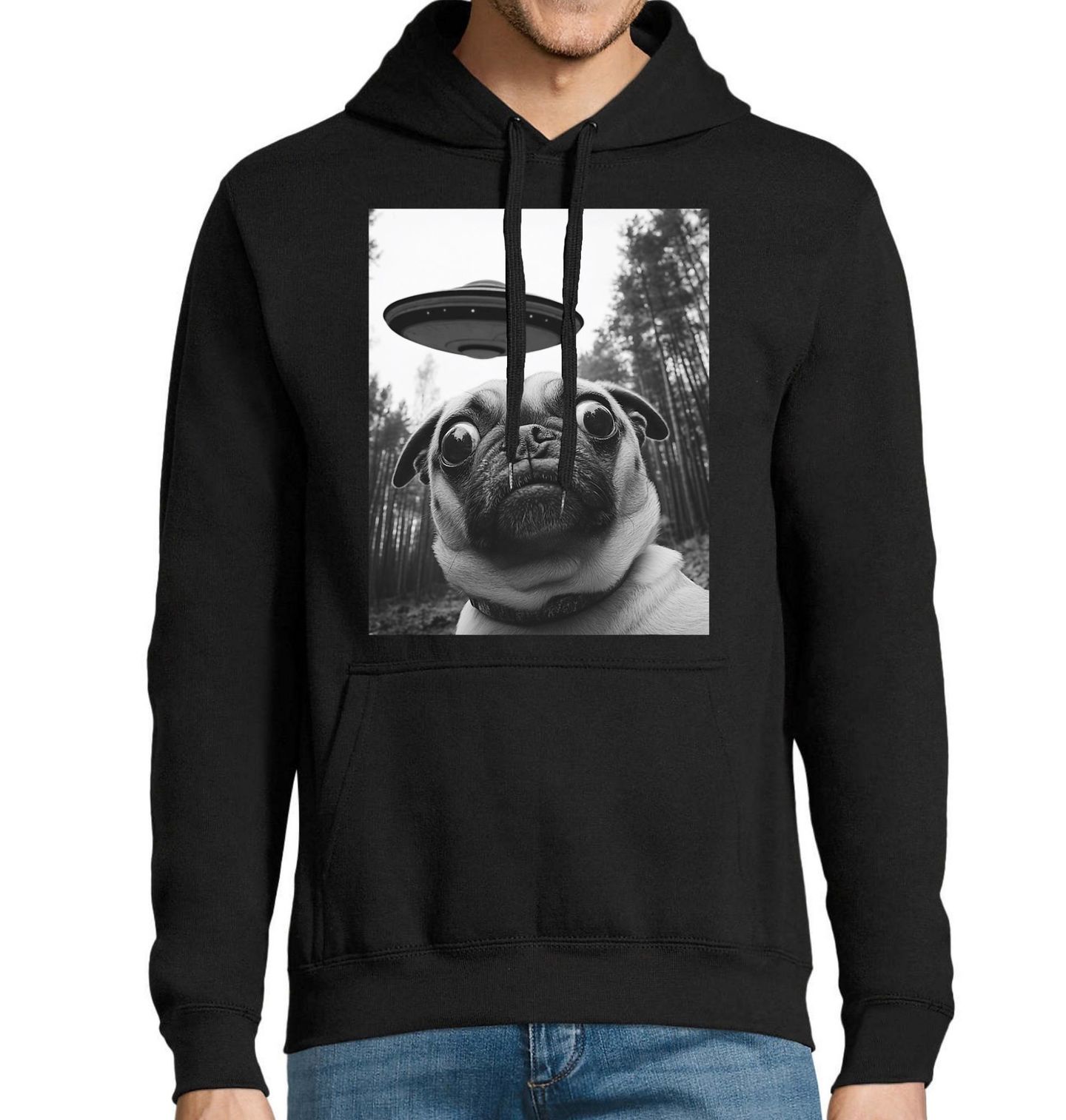 Pánská mikina Selfie Mopse a UFO. Zvědavý pes plemene mops se ocitá uprostřed nečekaného setkání s UFO, což vytváří vtipný a zároveň tajemný motiv. Velké oči a výraz mopsí zvědavosti dokonale ladí s absurdní situací v lesním prostředí. Tento design spojuje humor, sci-fi a lásku ke psům do jednoho originálního vizuálu.