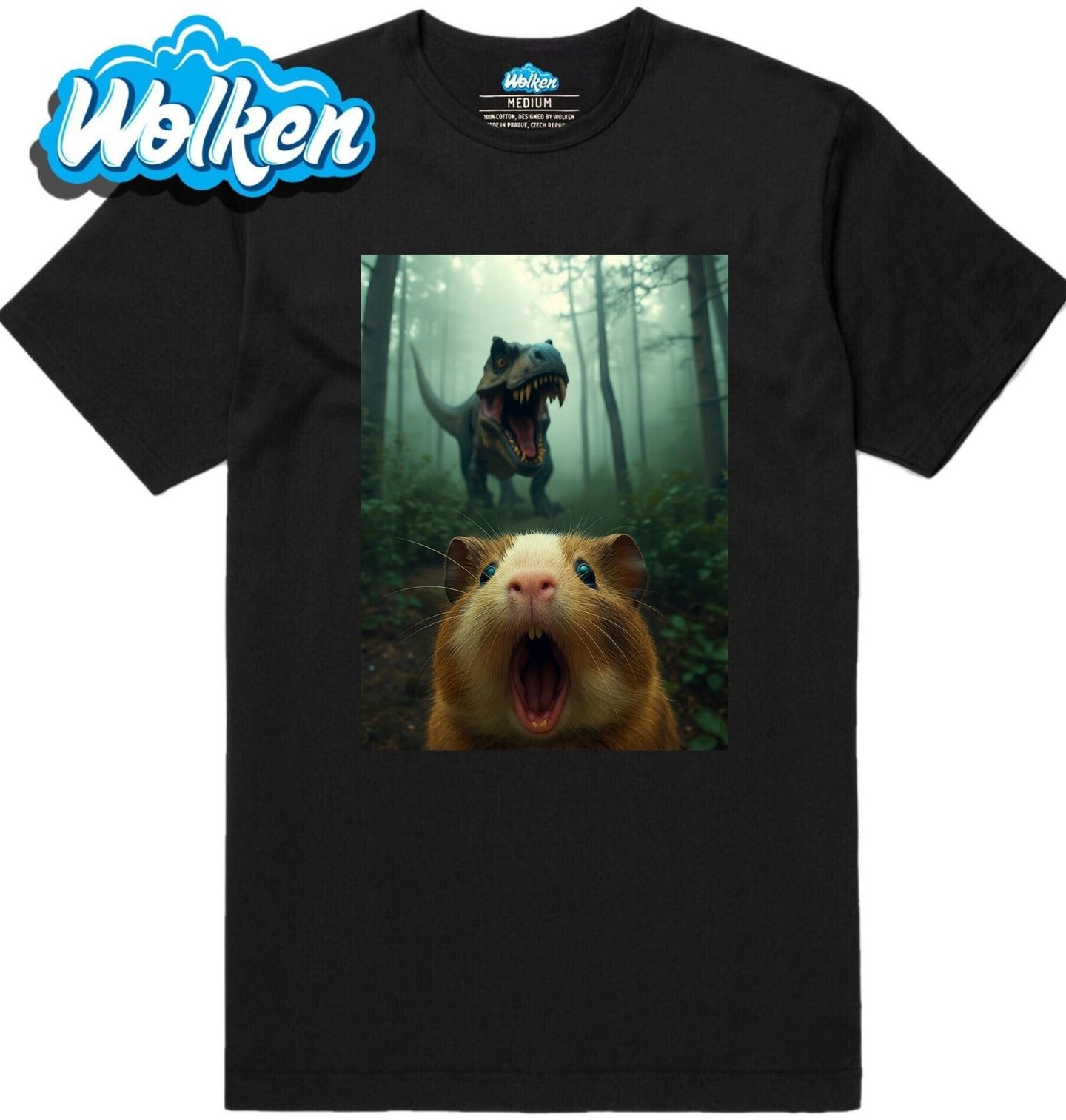 Pánské tričko Selfie Morčete a Útok T-Rexe. Originální motiv Selfie s T-Rexem je vtipným spojením nečekaného okamžiku – roztomilé morče pořizuje selfie, zatímco za ním číhá obrovský dinosaurus T-Rex. Tahle vtipná grafika pobaví každého milovníka zvířat, dinosaurů i těch, kdo rádi sdílí bláznivé momenty.
