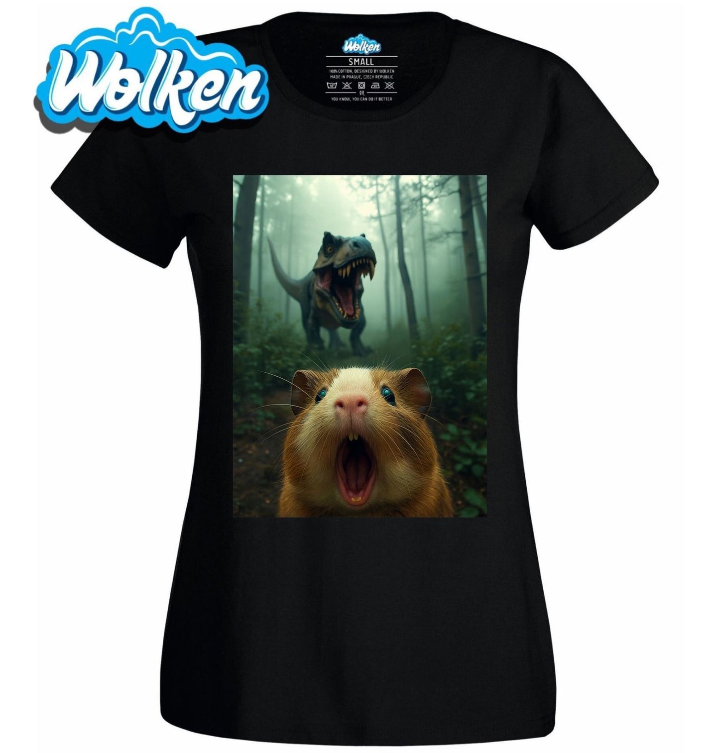 Dámské tričko Selfie Morčete a Útok T-Rexe. Originální motiv Selfie s T-Rexem je vtipným spojením nečekaného okamžiku – roztomilé morče pořizuje selfie, zatímco za ním číhá obrovský dinosaurus T-Rex. Tahle vtipná grafika pobaví každého milovníka zvířat, dinosaurů i těch, kdo rádi sdílí bláznivé momenty.