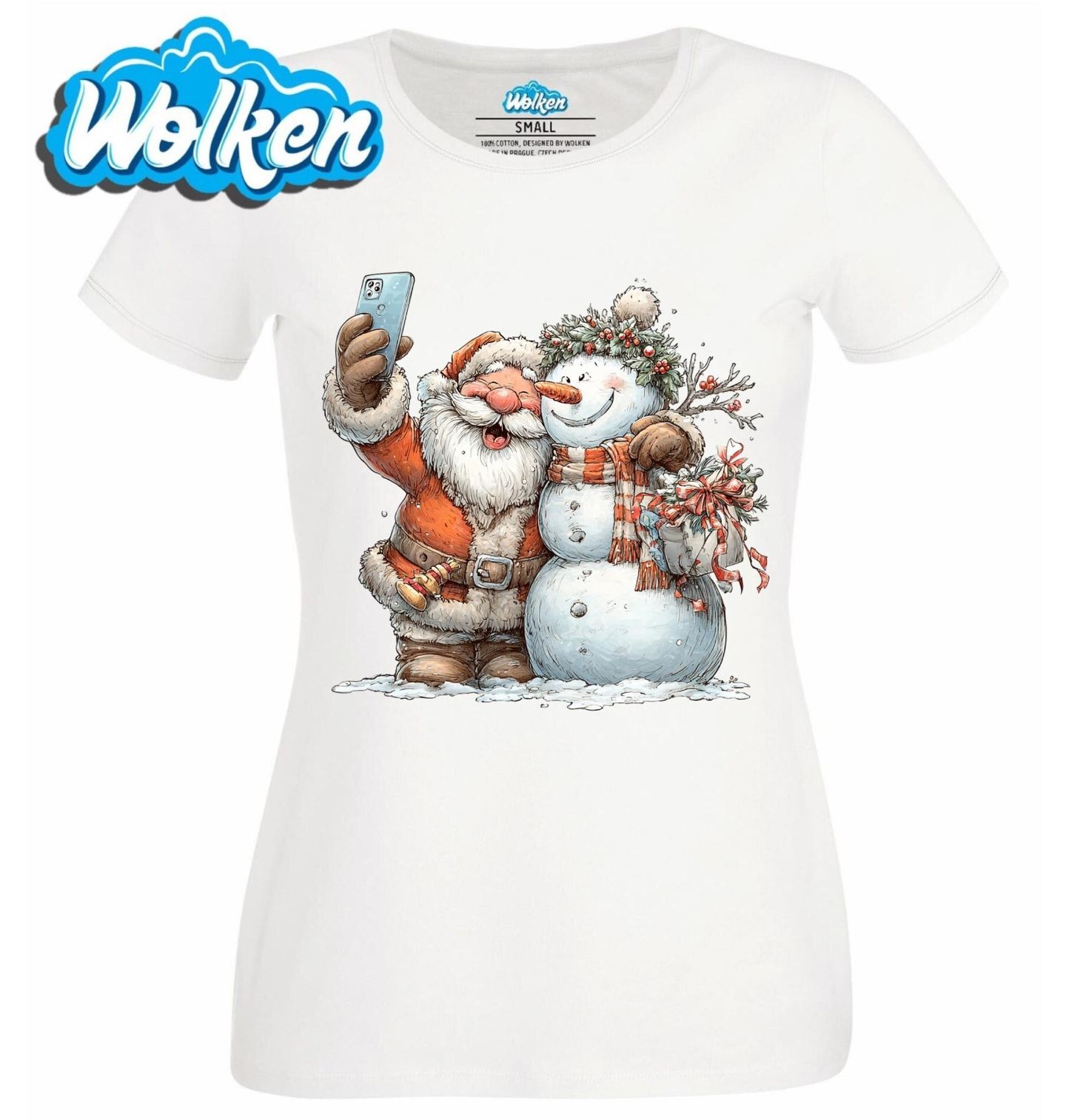 Dámské tričko Selfie Santy a Sněhuláka. Veselý motiv plný sváteční nálady, na kterém si Santa a sněhulák užívají společný zimní okamžik a pořizují si selfie. Scéna plná radosti, úsměvů a vánoční atmosféry, která připomíná, že Vánoce jsou o přátelství, smíchu a malých radostech.