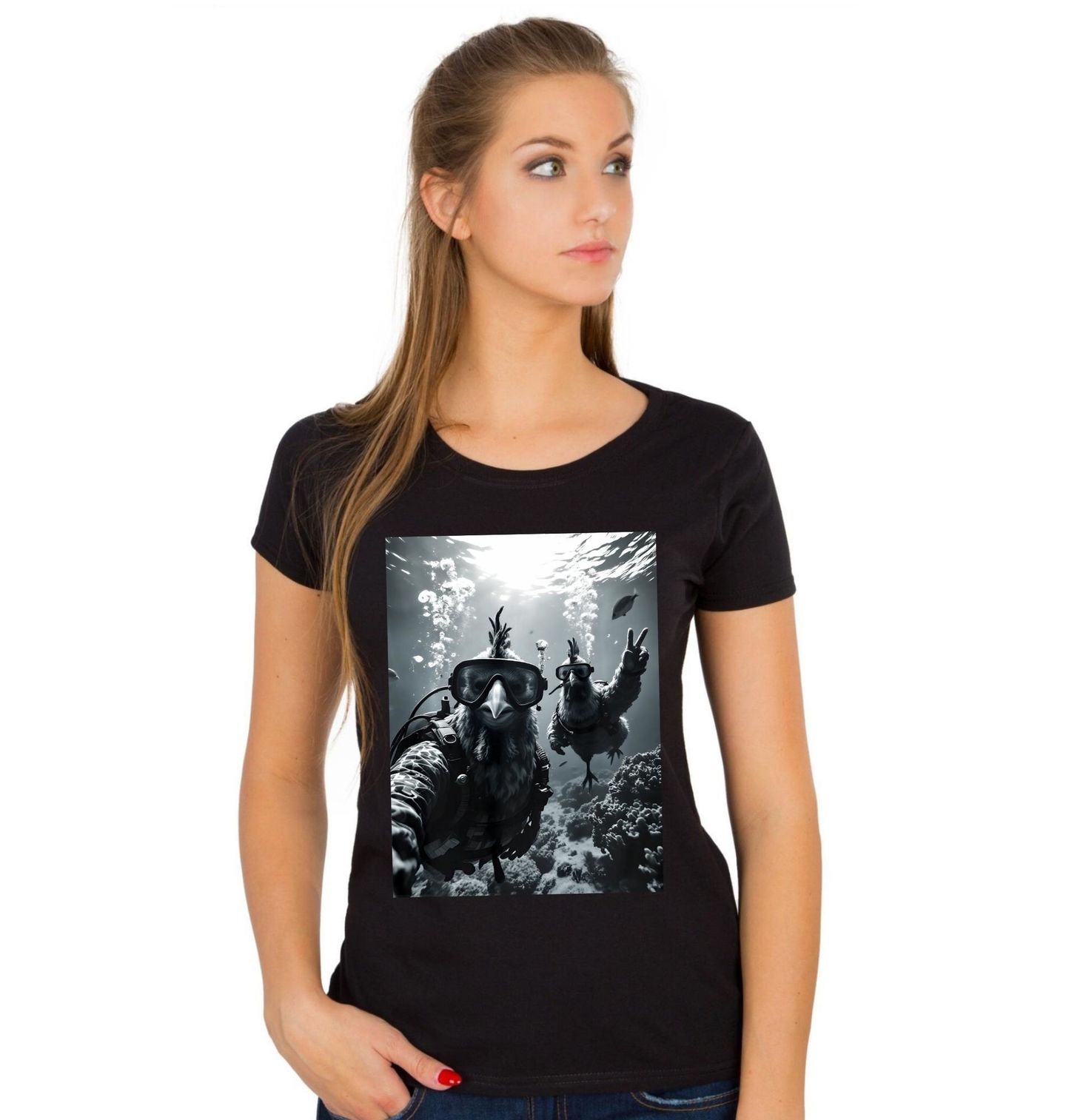 Dámské tričko Selfie Slepice Potápěči. Vtipný motiv zachycuje dvě slepice, které mají potápěčské brýle a výstroj a pořizují si podvodní selfie. Slepice se zde ocítají v netradičním prostředí pod hladinou moře mezi korály a rybami, což vytváří komický a surrealistický efekt. Motiv je ideální pro každého, kdo má rád absurdní humor a originální zvířecí designy.