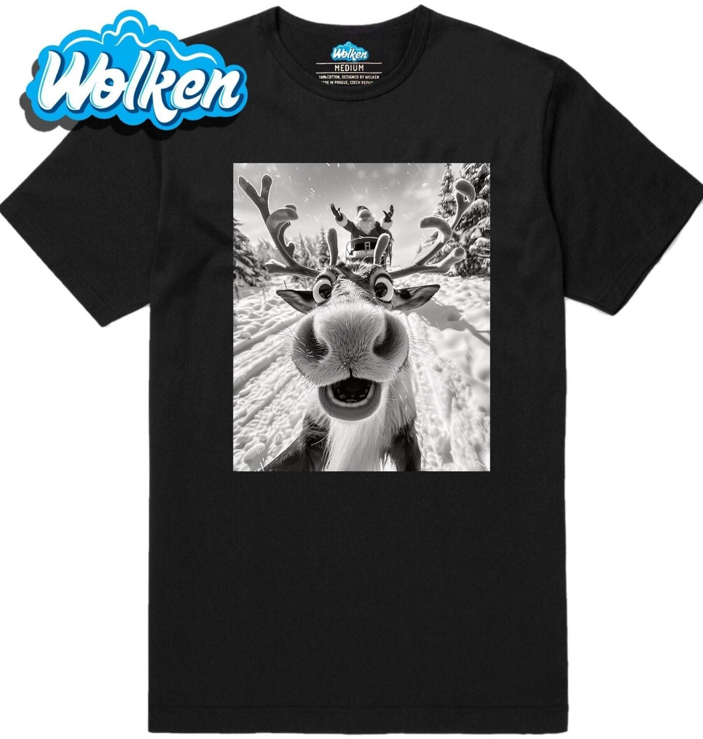 Pánské tričko Selfie Soba a Santy ve Sněhové Vánici. Udělejte si Vánoce ještě zábavnější s originálním motivem veselého soba, který si dělá bláznivé selfie, zatímco Santa Claus spokojeně mává ze saní. Tento hravý obrázek spojuje tradiční sváteční kouzlo s moderním humorem a je ideální pro každého, kdo má rád Vánoce s úsměvem.