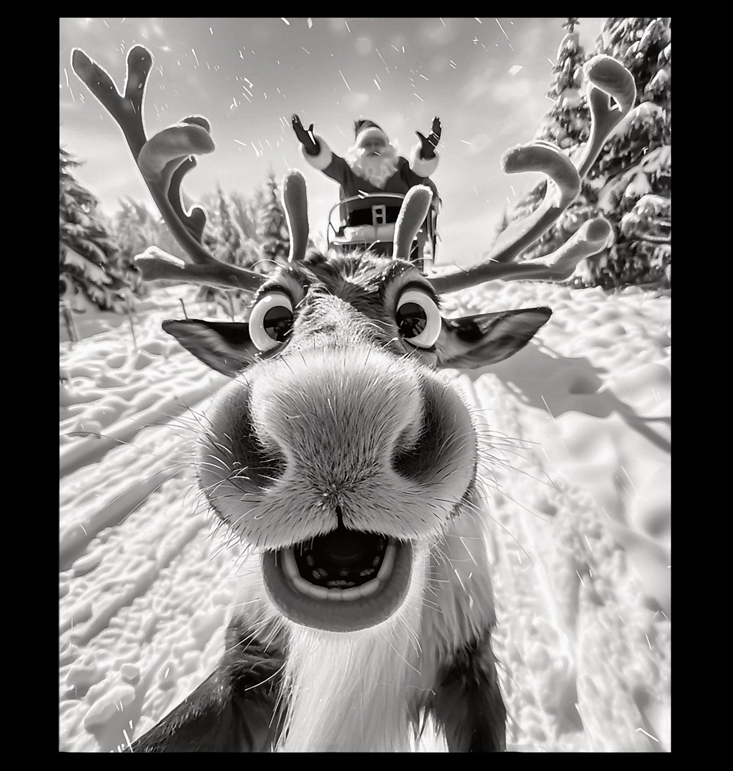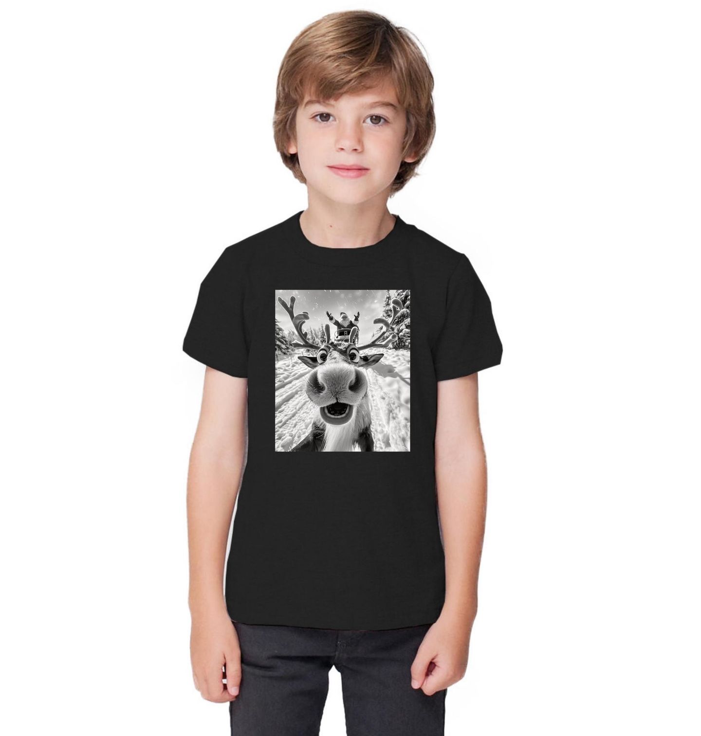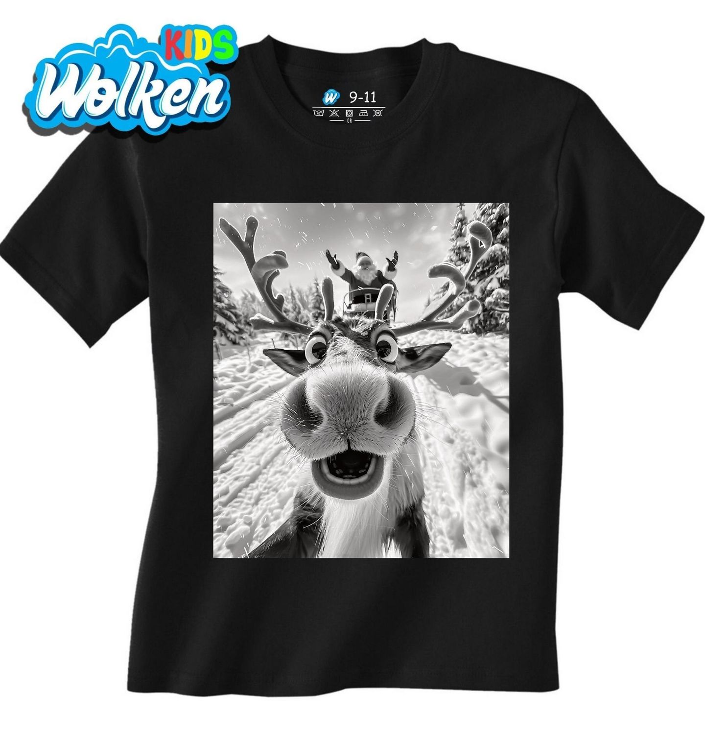 Dětské tričko Selfie Soba a Santy ve Sněhové Vánici. Udělejte si Vánoce ještě zábavnější s originálním motivem veselého soba, který si dělá bláznivé selfie, zatímco Santa Claus spokojeně mává ze saní. Tento hravý obrázek spojuje tradiční sváteční kouzlo s moderním humorem a je ideální pro každého, kdo má rád Vánoce s úsměvem.