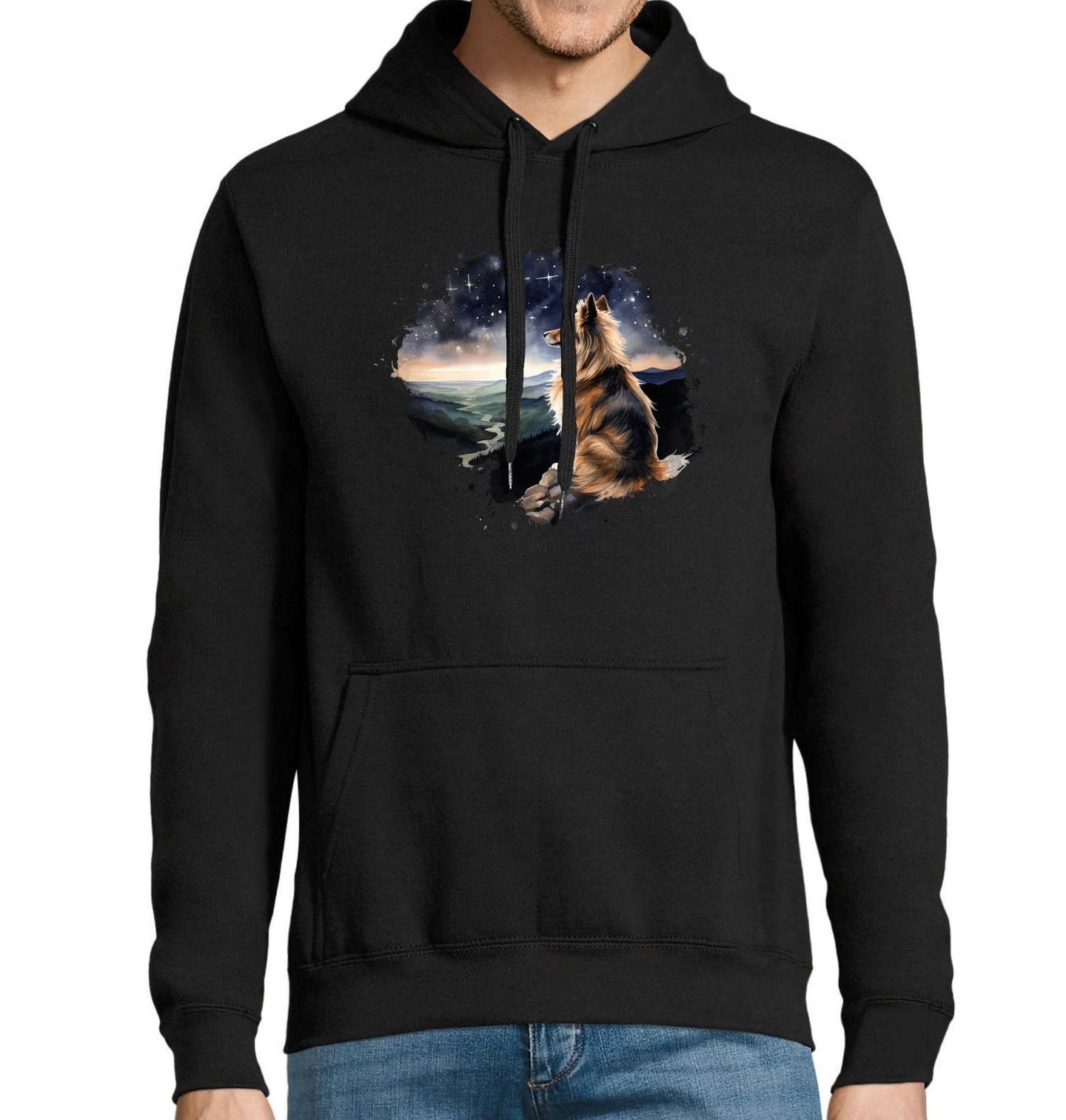 Pánská mikina Šeltie na Vyhlídce. Tato okouzlující ilustrace zachycuje, jak Šeltie (Shetlandský ovčák) sedí na skále a sleduje tiché panorama noční krajiny. Je to motiv, který zaujme každého pejskaře, jenž ví, že pes je nejen nejlepší přítel, ale také tichý pozorovatel našich cest a emocí.