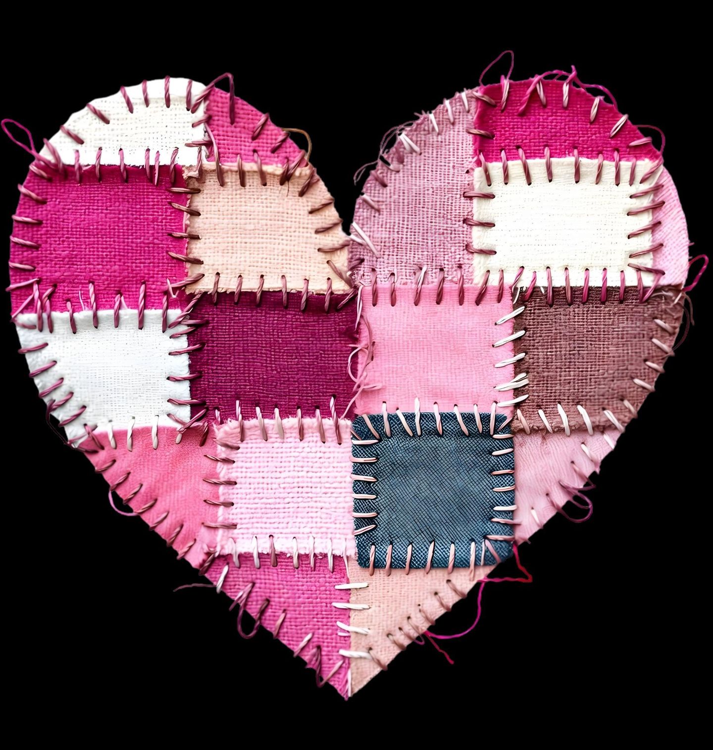 Dámské tričko Sešité Srdce. Originální motiv ve tvaru srdce vytvořený z barevných látkových záplat symbolizuje láska, která vzniká z drobných kousků, vzpomínek a emocí. Viditelné stehy a patchworkový styl dodávají designu autentičnost, jemnost a pocit ruční práce.