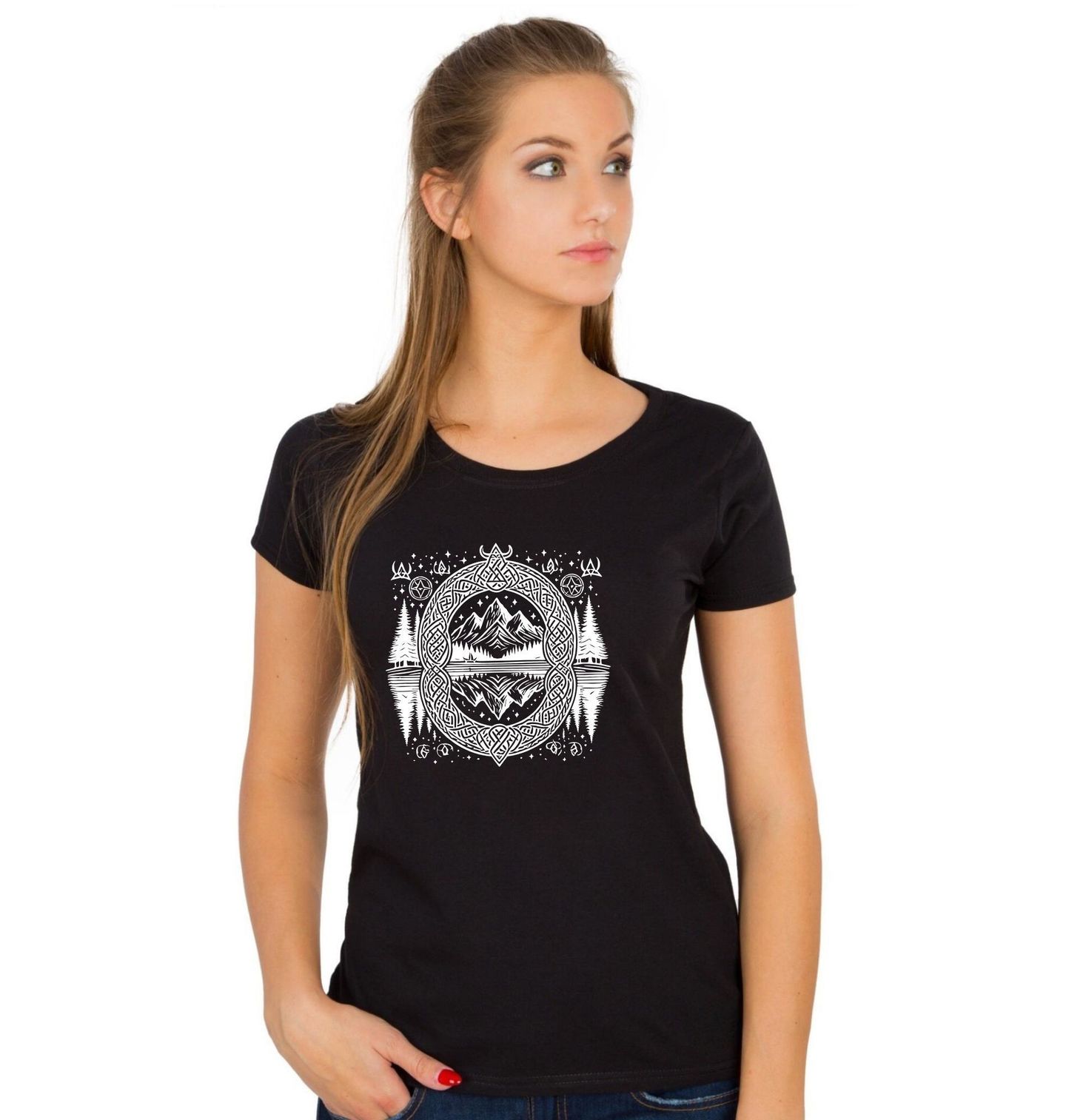 Dámské tričko Severské Hory v Keltském Uzlu. Tento jedinečný motiv spojuje přírodu a mytologii – majestátní hory odrážející se na hladině jezera, obklopené lesem, jsou zasazeny do bohatě zdobeného rámu s keltskými uzly. Symboly připomínající tradice keltové i vikingové dodávají designu mystickou a duchovní atmosféru.