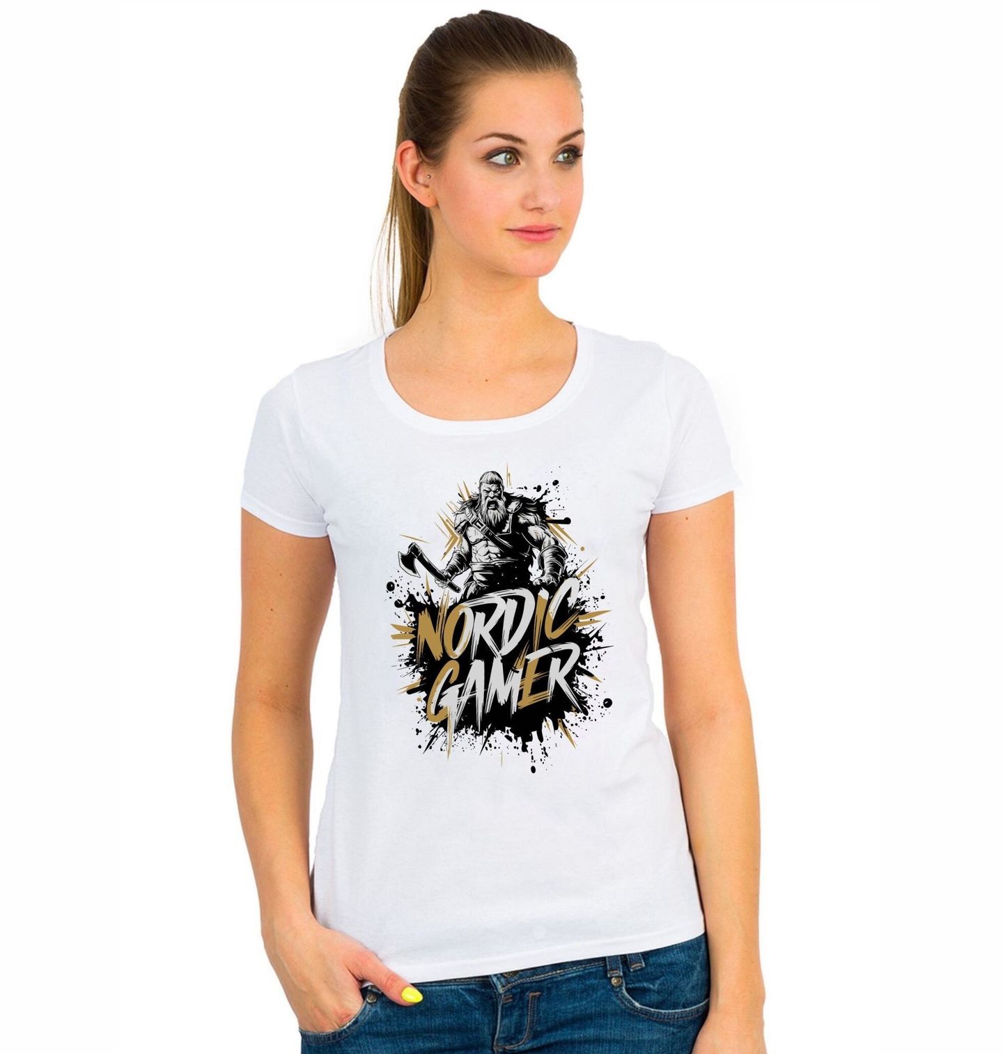 Dámské tričko Severský Hráč Nordic Gamer. Motiv je ideální pro hráče, kteří se nebojí výzev a berou hraní jako souboj plný strategie, odvahy a vytrvalosti. Spojení vikingské estetiky a gamer identity vytváří originální design pro všechny, kdo chtějí dát najevo svou vášeň pro hry a severskou mytologii.