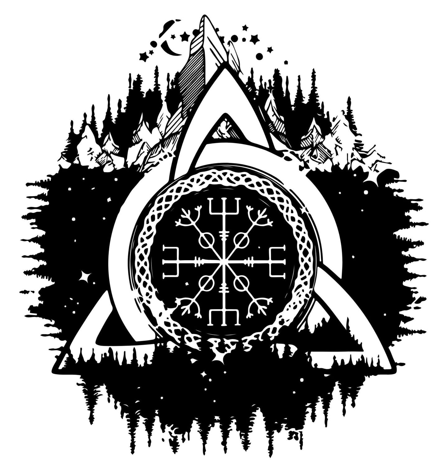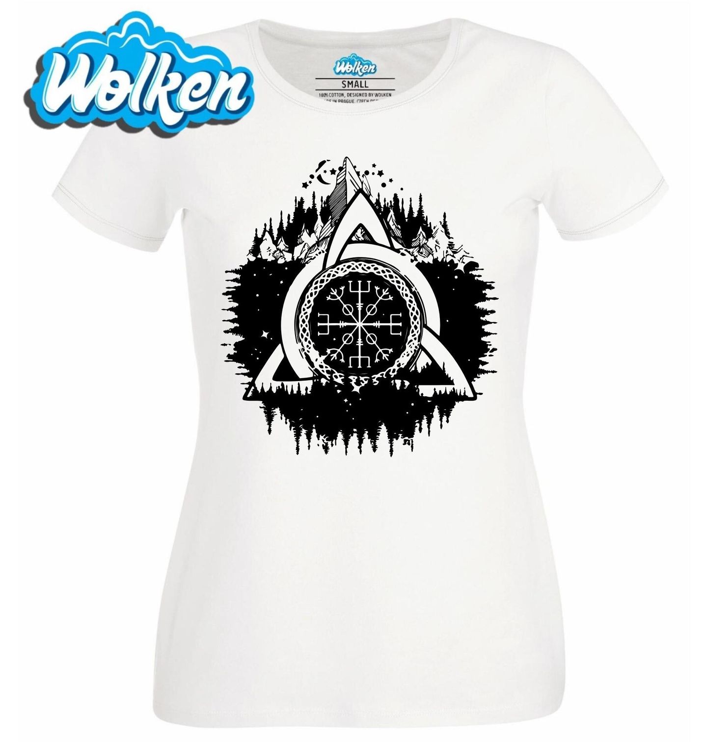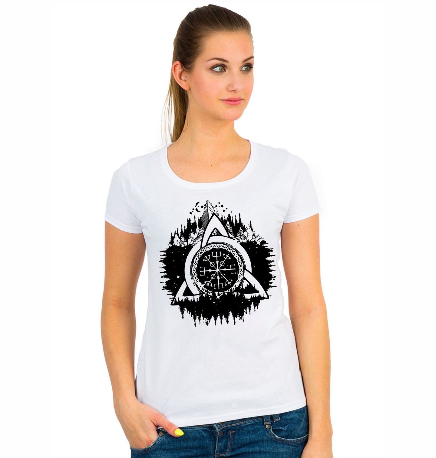 Dámské tričko Severský Symbol. Vegvísir (runový kompas) je vikingský ochranný znak, který měl nositele vždy navést na správnou cestu, i v bouři a temnotě a Triquetra (keltský trojitý uzel) je symbol propojení – minulost, přítomnost, budoucnost nebo život, smrt, znovuzrození. Ideální pro každého, koho zajímá vikingská mytologie, keltské tradice a historické symboly starověké Evropy.