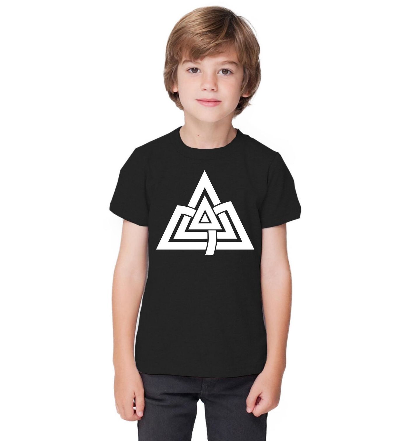 Dětské tričko Severský Symbol Síly. Minimalistický motiv zobrazuje vikingský symbol Valknut, tvořený třemi propojenými trojúhelníky. Tento staroseverský znak je často spojován s bohem Ódinem, osudem a silou bojovníků. Jednoduchý a výrazný motiv osloví všechny fanoušky severské mytologie, Vikingů a symboliky starých kultur.