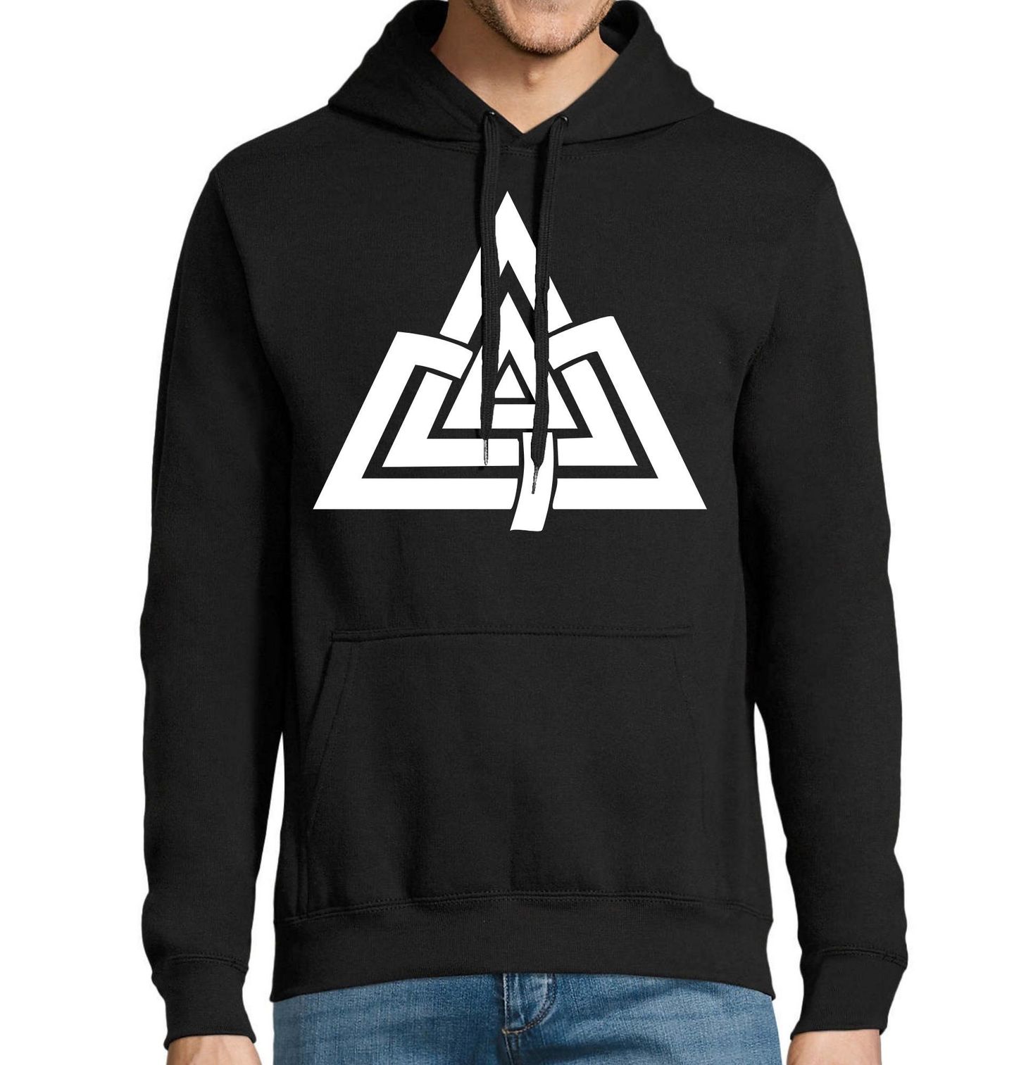 Pánská mikina Severský Symbol Síly. Minimalistický motiv zobrazuje vikingský symbol Valknut, tvořený třemi propojenými trojúhelníky. Tento staroseverský znak je často spojován s bohem Ódinem, osudem a silou bojovníků. Jednoduchý a výrazný motiv osloví všechny fanoušky severské mytologie, Vikingů a symboliky starých kultur.