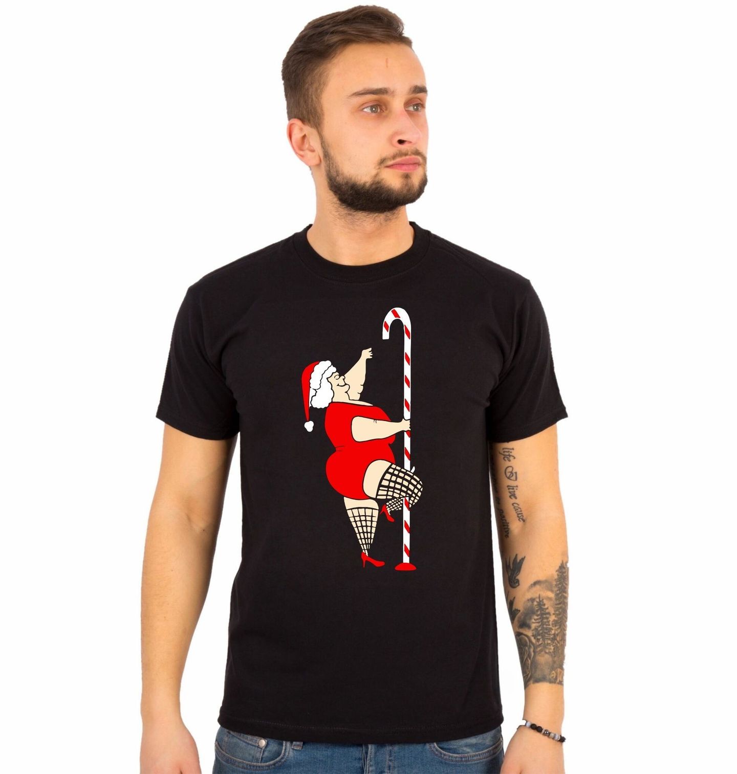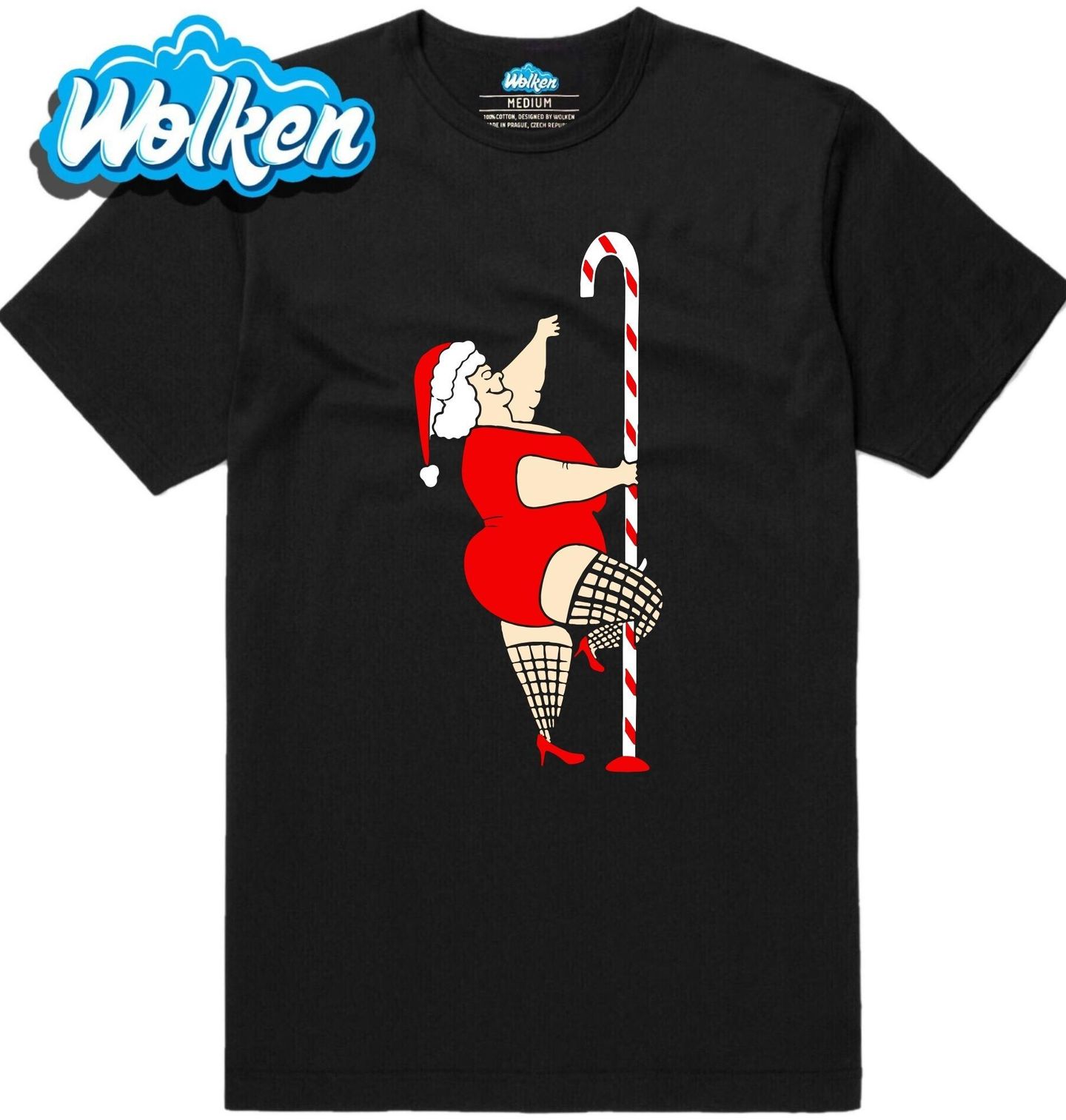 Pánské tričko Sexy Santova Žena u Tyče. Vánoce nemusí být jen o stromečku a dárcích – s tímto vtipným motivem se postarají o pořádnou dávku smíchu! Santova žena se totiž rozhodla ozdobit svátky po svém a rozjela pole dance u obří vánoční cukrové tyče. Červené šaty, síťované punčochy a vánoční čepice dodávají celé scéně humorný a provokativní nádech.