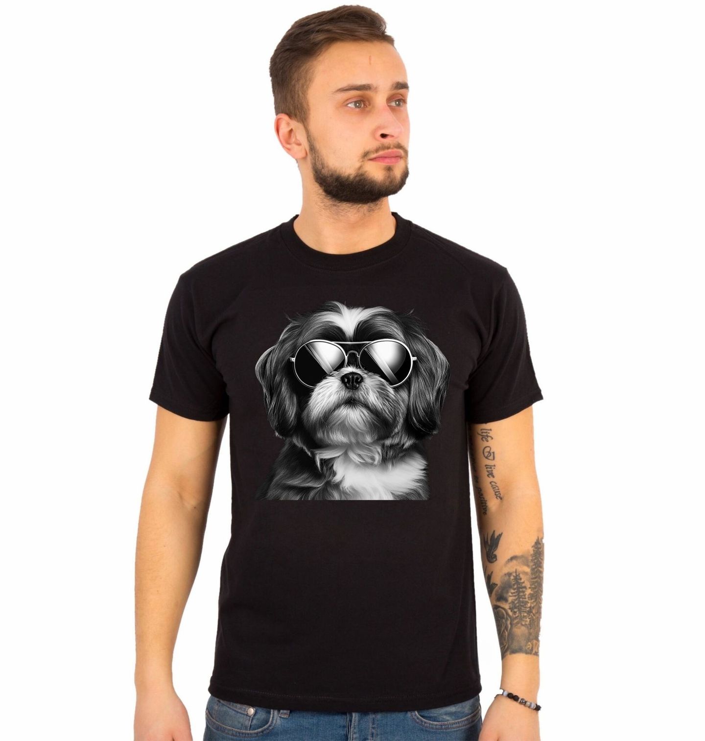 Pánské tričko Shih-tzu s Brýlemi. Originální a hravý motiv, kde vystupuje Shih-tzu v stylových brýlích, zaujme každého milovníka malých společenských plemen. Tento design spojuje roztomilost a humor, takže potěší každého, pro koho je pes věrným parťákem a kdo je hrdý pejskař. Shih-tzu je známý svou přátelskou povahou, hebkou srstí a elegantním vzhledem, což motiv krásně vystihuje.