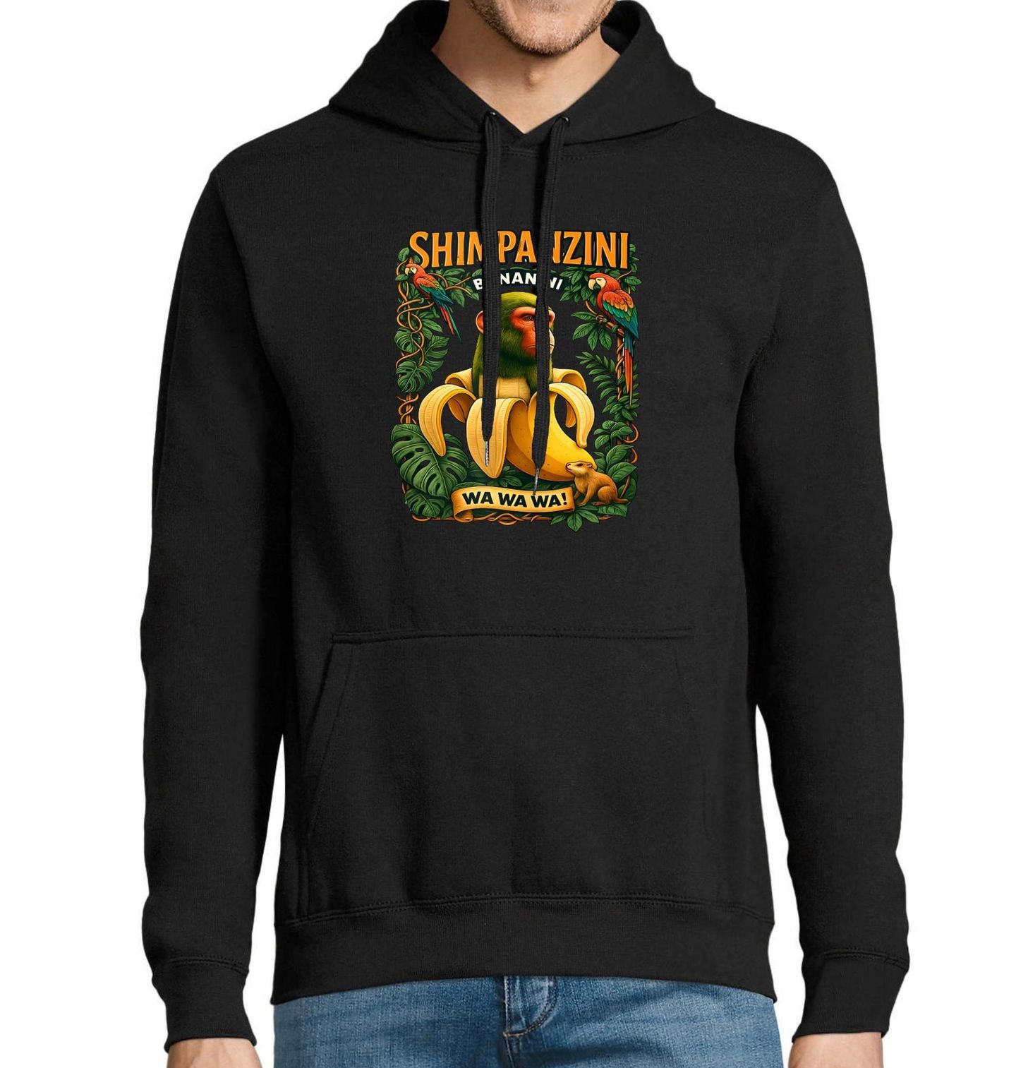 Pánská mikina Shimpanzini Bananini Wa Wa Wa! Toto není obyčejná opice. Toto je majestátní šimpanz v luxusní banánové slupce, obklopený džunglí, papoušky a němým výkřikem „wa wa wa!“ Tropické memové šílenství, které ignoruje logiku a slaví absurdno.
