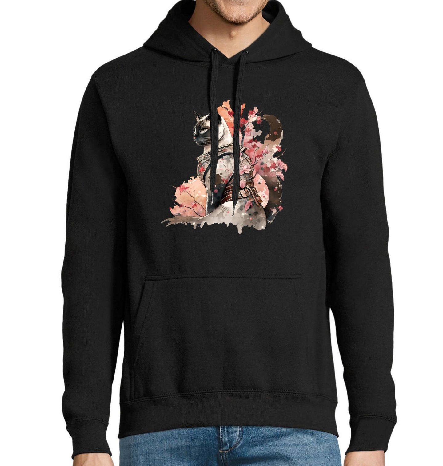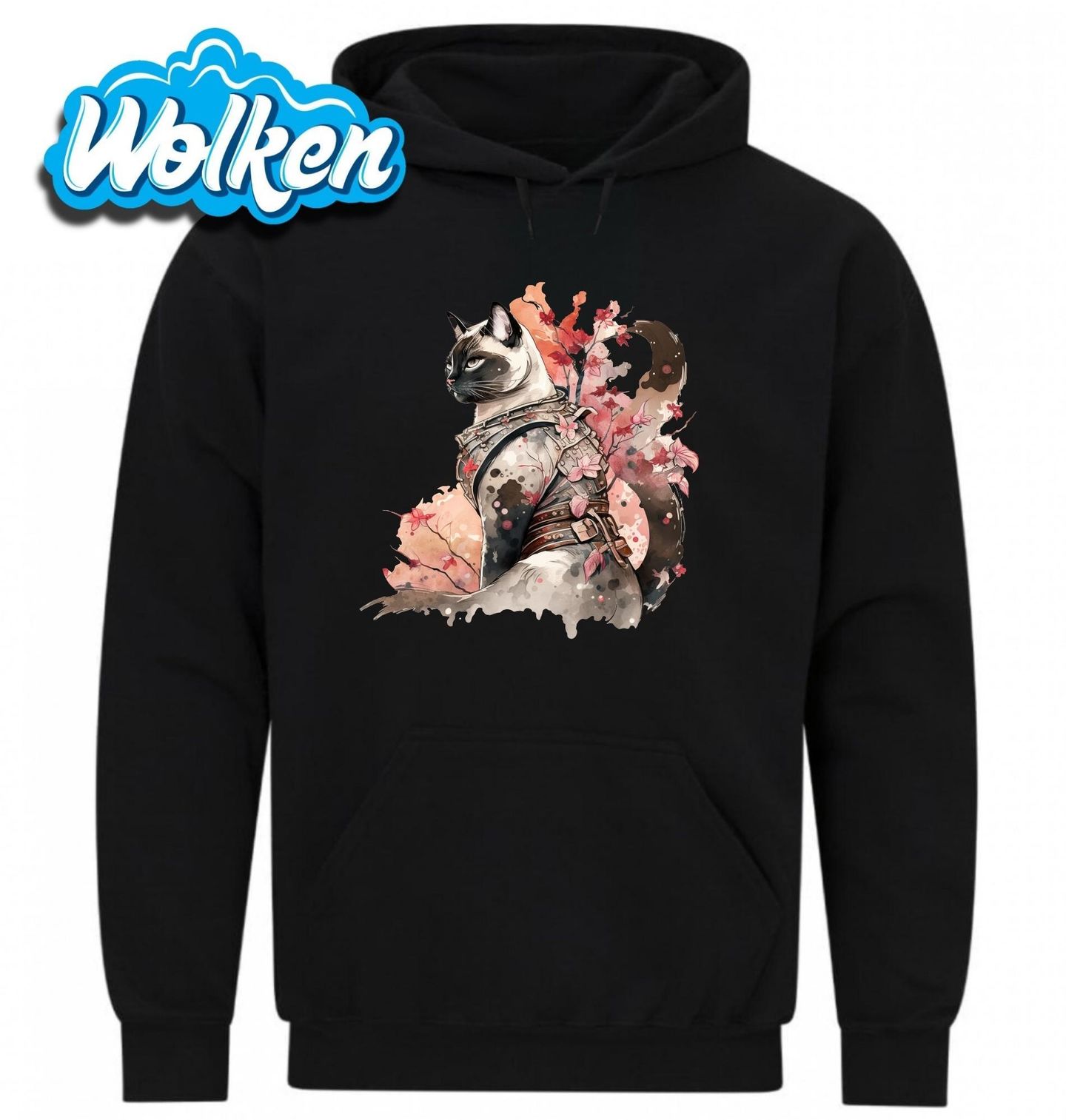 Pánská mikina Siamská Kočka Samuraj. Kočka bojovník v detailně propracovaném brnění samuraje stojí klidně v rozkvětlém háji sakury, což symbolizuje rovnováhu mezi vnitřní silou a krásou přírody. Ideální pro ty, kdo milují nevšední motivy a zároveň chtějí nosit tričko, které křičí Japonsko!
