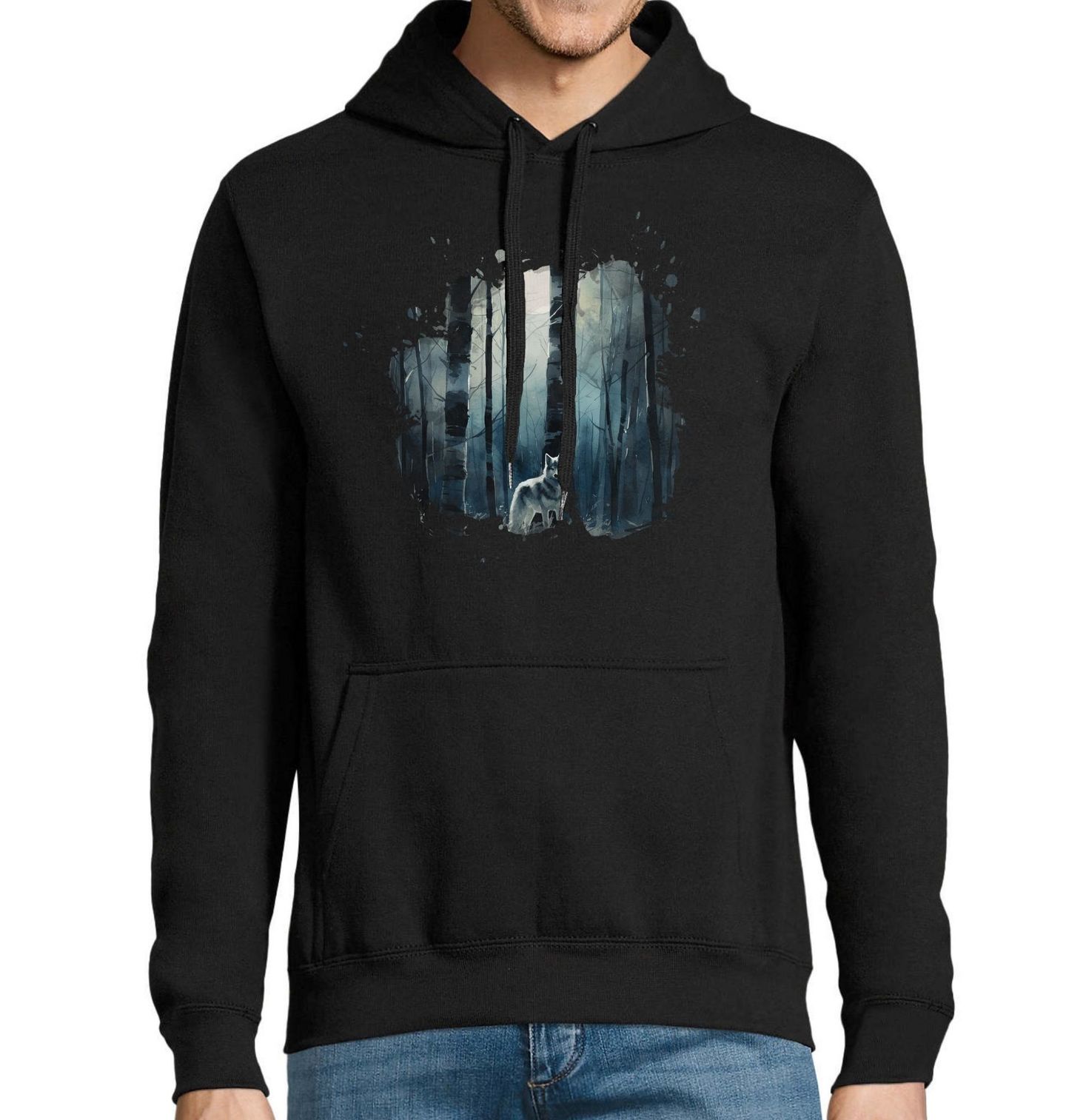 Pánská mikina Sibiřský Husky Hlídač Severu. Tajemná scéna zasněženého lesa a osamocený sibiřský husky, který se jako stín pohybuje mezi břízami. Tento klidný, silný a nezávislý pes ztělesňuje ducha divočiny a severské svobody. Motiv je ideální pro každého pejskaře, který obdivuje krásu přírody, samotu a vnitřní sílu, kterou toto plemeno přirozeně vyzařuje.