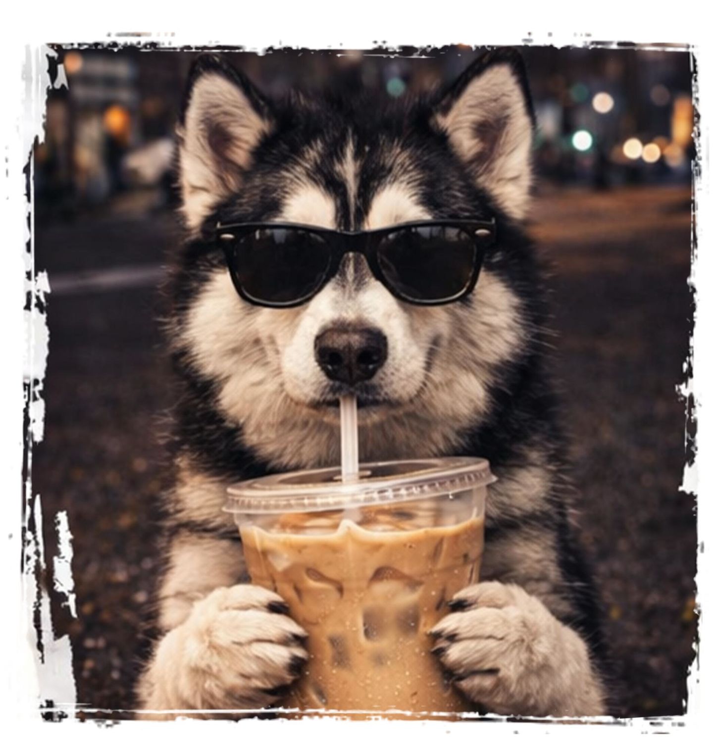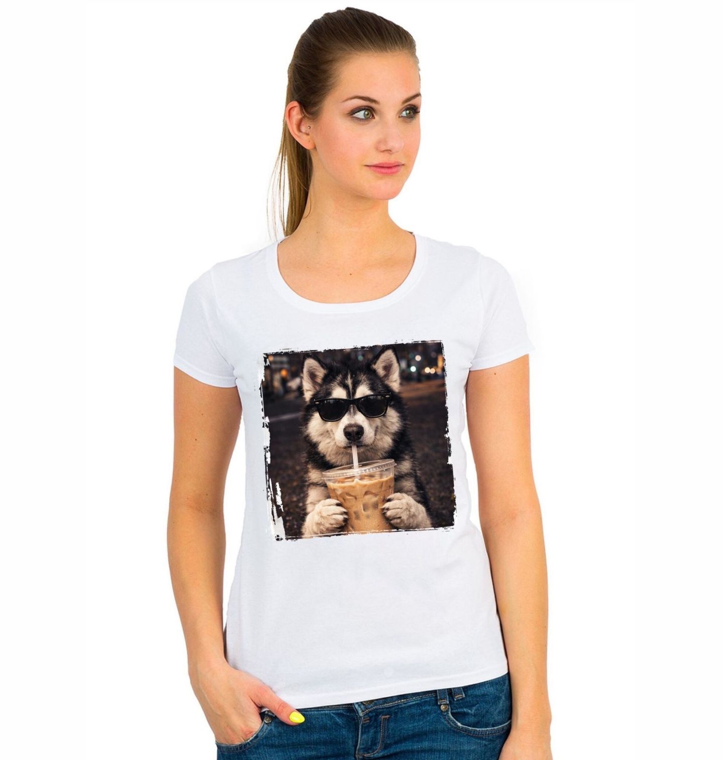 Dámské tričko Sibiřský Husky s Ledovou Kávou. Na obrázku je plemeno sibiřský husky, ledová káva v jeho tlapkách v moderním městském prostředí. Tento pes působí sebevědomě a pohodově, což z něj dělá ideální motiv pro každého pejskaře, který miluje originální a vtipné designy. Potěší každého pejskaře, který má rád styl, humor a jedinečný vzhled.