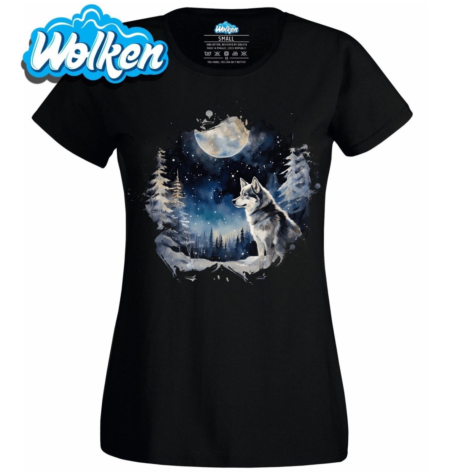 Dámské tričko Sibiřský Husky ve Sněhu. Tento kouzelný motiv zobrazuje sibiřského huskyho stojícího v zasněžené krajině pod hvězdnou oblohou a měsícem v úplňku. Vyzařuje klid, hrdost a přirozenou krásu, kterou toto severské plemeno přináší. Tento pes je symbolem volnosti a věrnosti, což ocení každý opravdový pejskař.