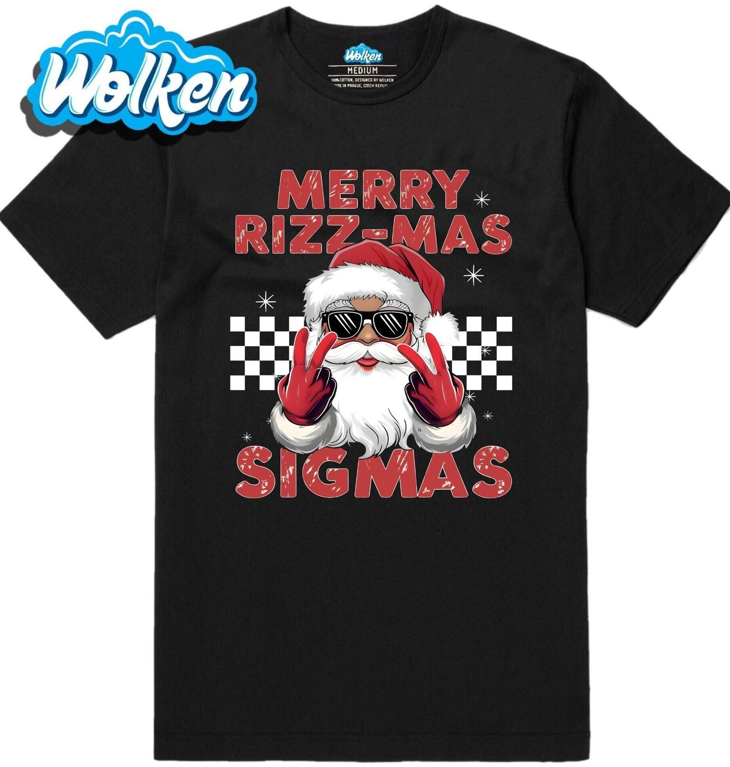 Pánské tričko Sigma Vánoce Merry Rizz-Mas Sigmas. Stylový Santa pro každého, kdo jede na vlně sebevědomí a šarmu! Motiv „Merry Rizz-mas Sigmas“ je vtipným spojením slov "Christmas" a "Rizz" (slangově výraz pro charisma nebo schopnost okouzlit), doplněný o narážku na „sigma“ typ člověka – sebejistého a nezávislého.