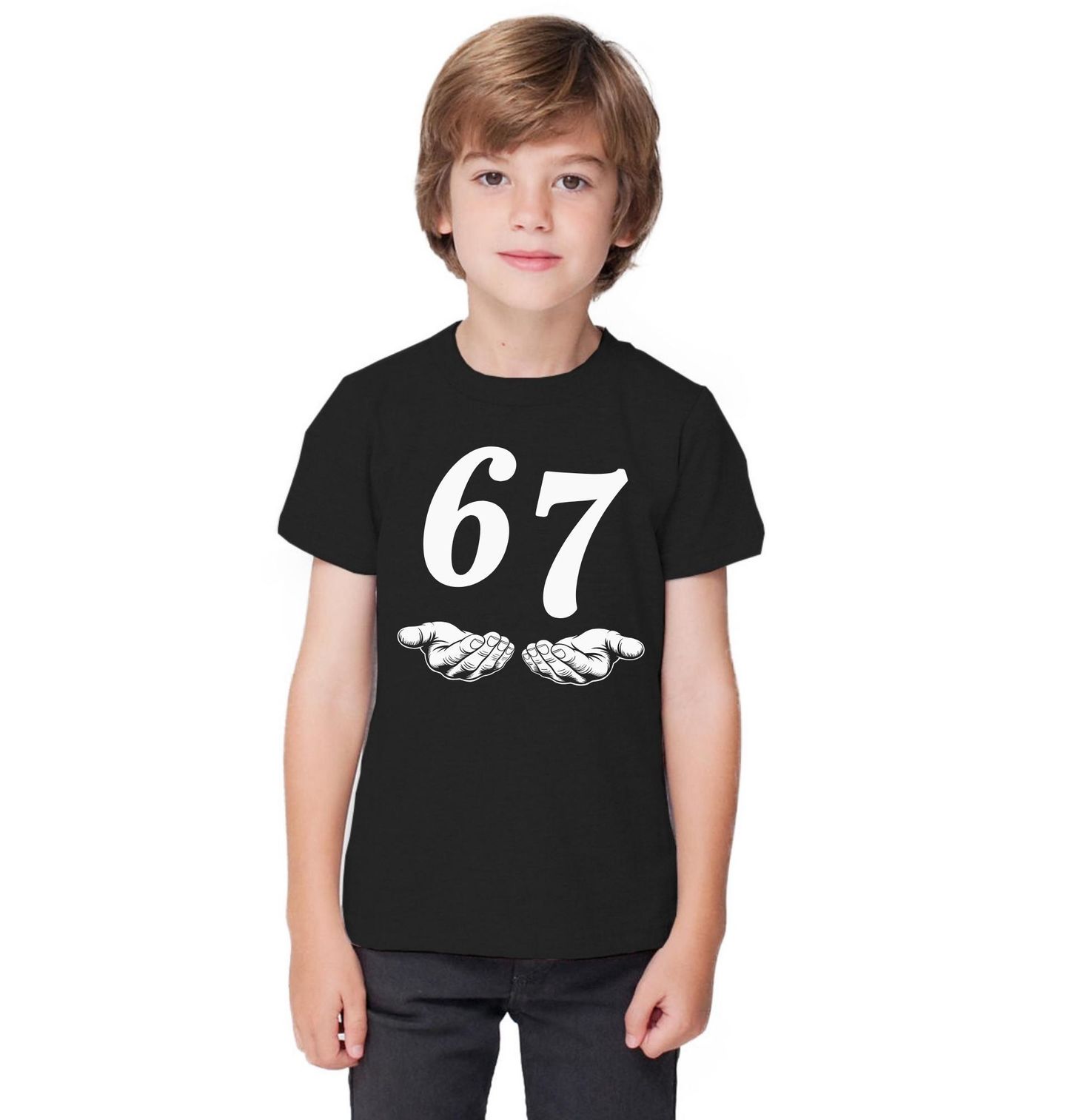 Dětské tričko Síla 67 v Rukou Six Seven. Originální motiv 67 držené v otevřených dlaních přináší minimalistický, ale výrazný six seven meme styl. Jednoduché bílé ruce pod číslem vytvářejí symbol podpory, energie a lehkého humoru. Tenhle design je ideální pro fanoušky čísla 67, internetové kultury a meme motivů.