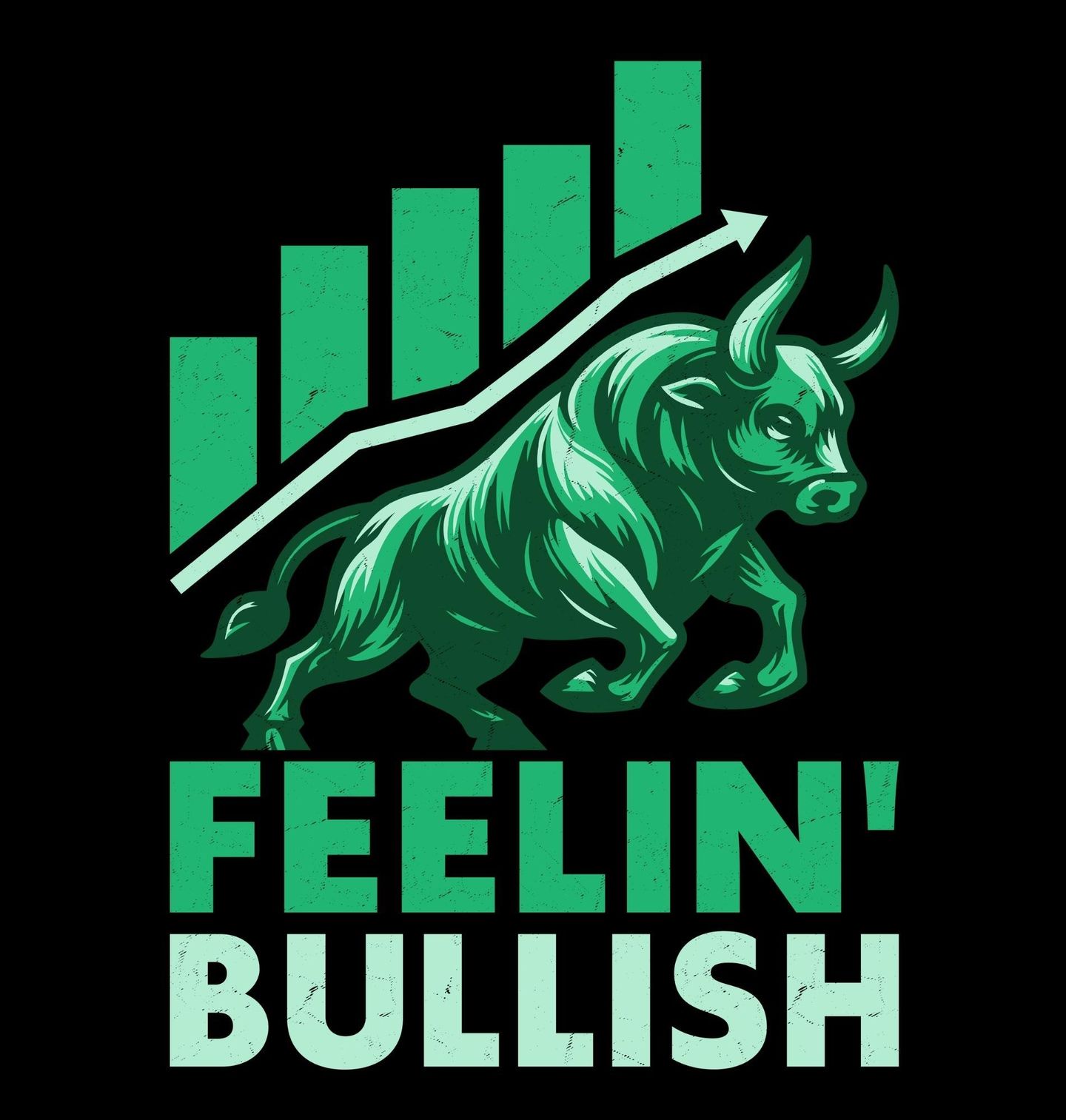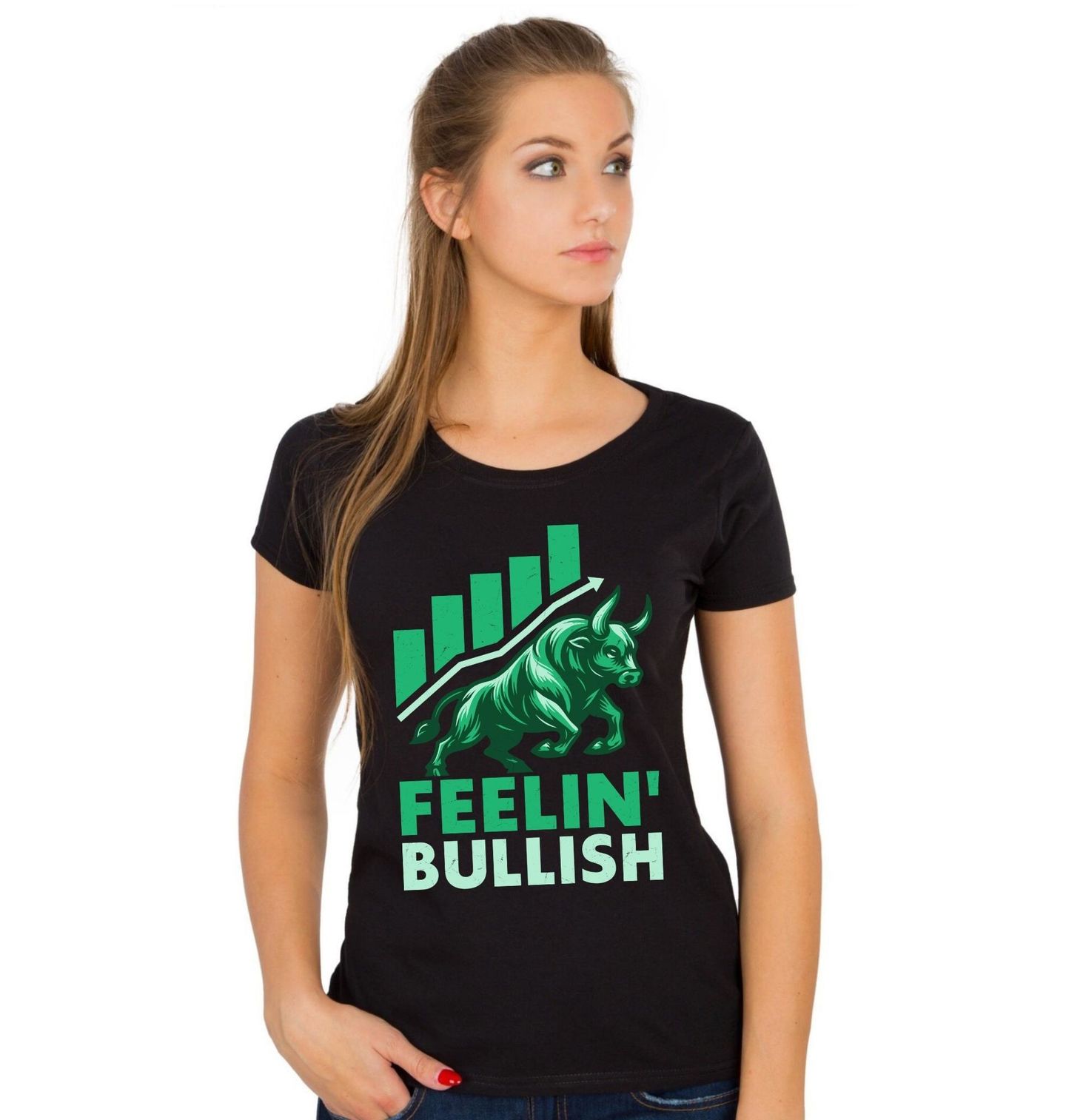 Dámské tričko Síla Býka. Tento moderní design zobrazuje silného býka symbolizujícího růst a prosperitu na finančních trzích. Nápis „FEELIN’ BULLISH“ znamená „Cítím se optimisticky (na růst)“ a skvěle vystihuje pozitivní náladu investorů. Ideální design pro všechny, kteří věří v růst trhu a milují grafy.