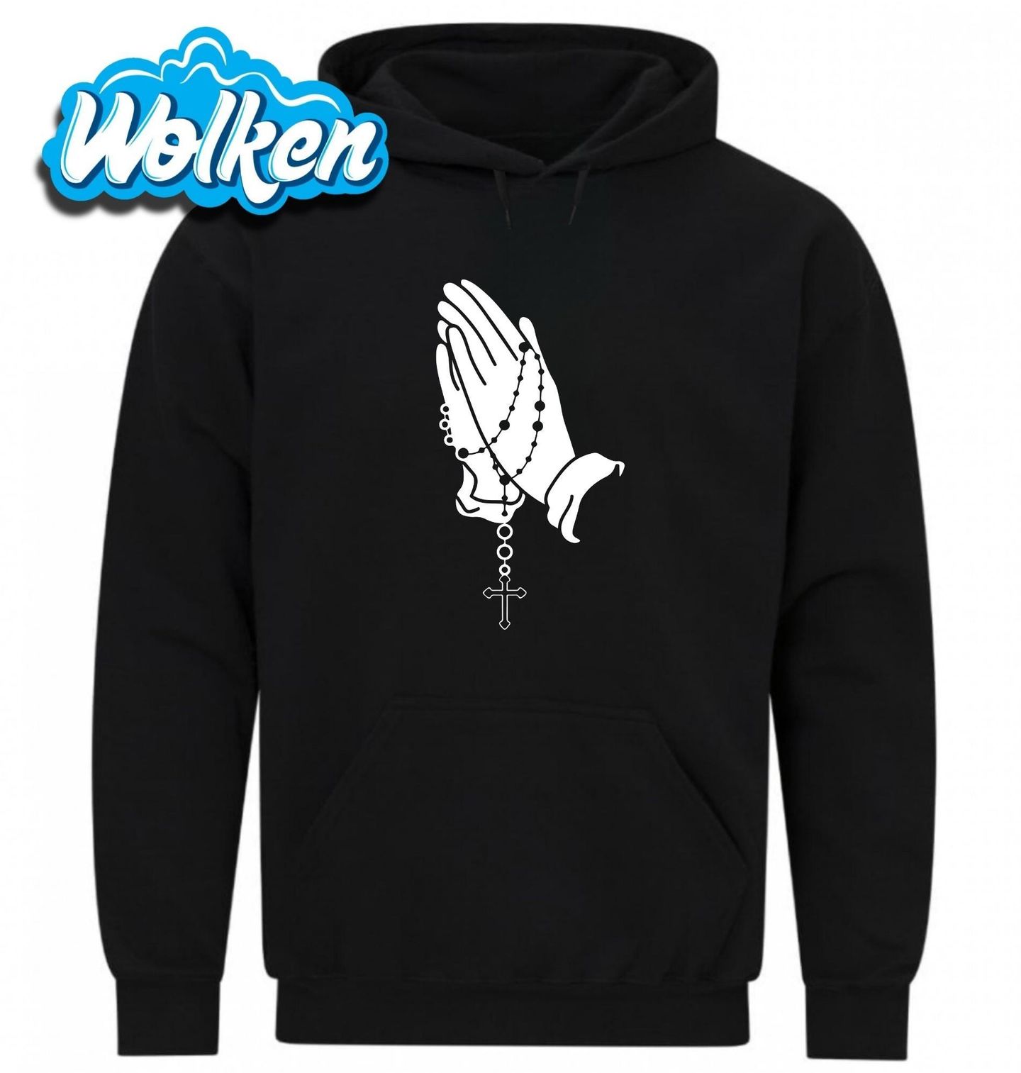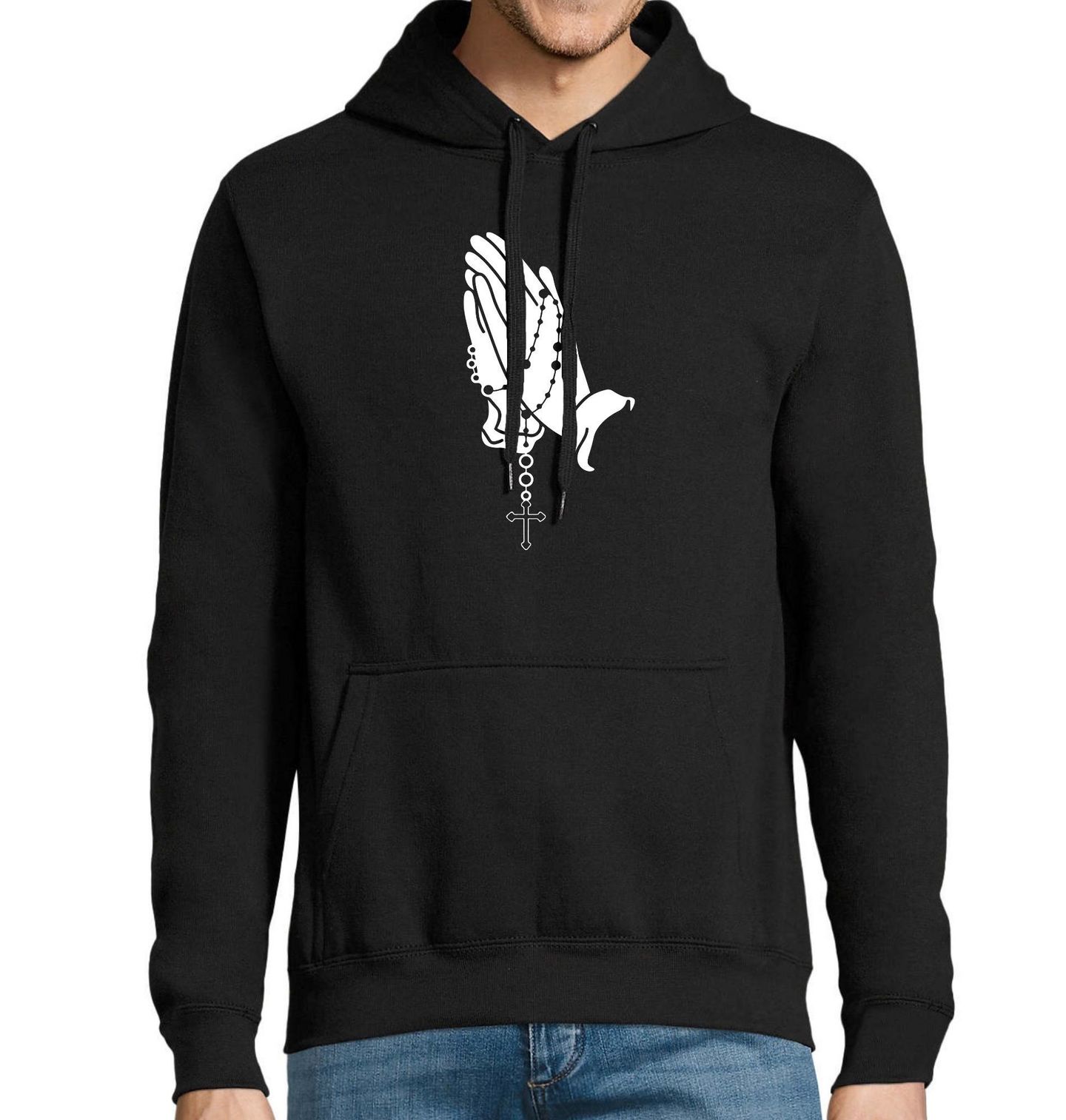 Pánská mikina Síla modlitby Praying Hands. Motiv modlících se rukou s růžencem a křížem je symbolem hluboké víry, pokory a oddanosti. Spojení náboženství, kříže a odkazu Ježíše Krista připomíná sílu modlitby a naděje. Ideální dárek pro všechny, kteří čerpají svou sílu z duchovna a víry.