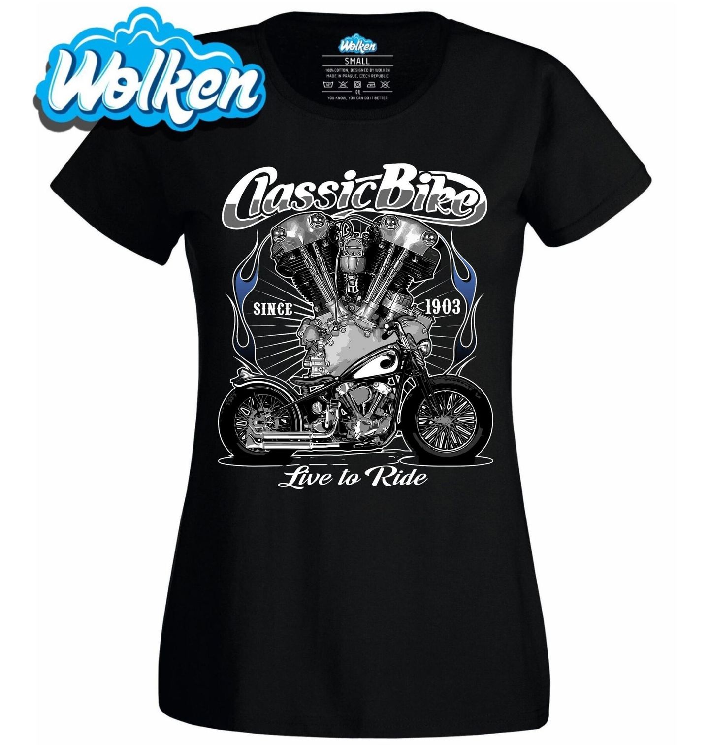 Dámské tričko Síla Motoru V-Twin Classic Bike Live to Ride. Rok 1903 v motivu odkazuje na Harley-Davidson, legendární americkou značku, která byla založena v roce 1903. Tento rok je v moto světě považován za symbolický začátek éry klasických motorek, především s typickým V-Twin motorem. „Live to Ride“ – oblíbené moto motorkářů po světě.