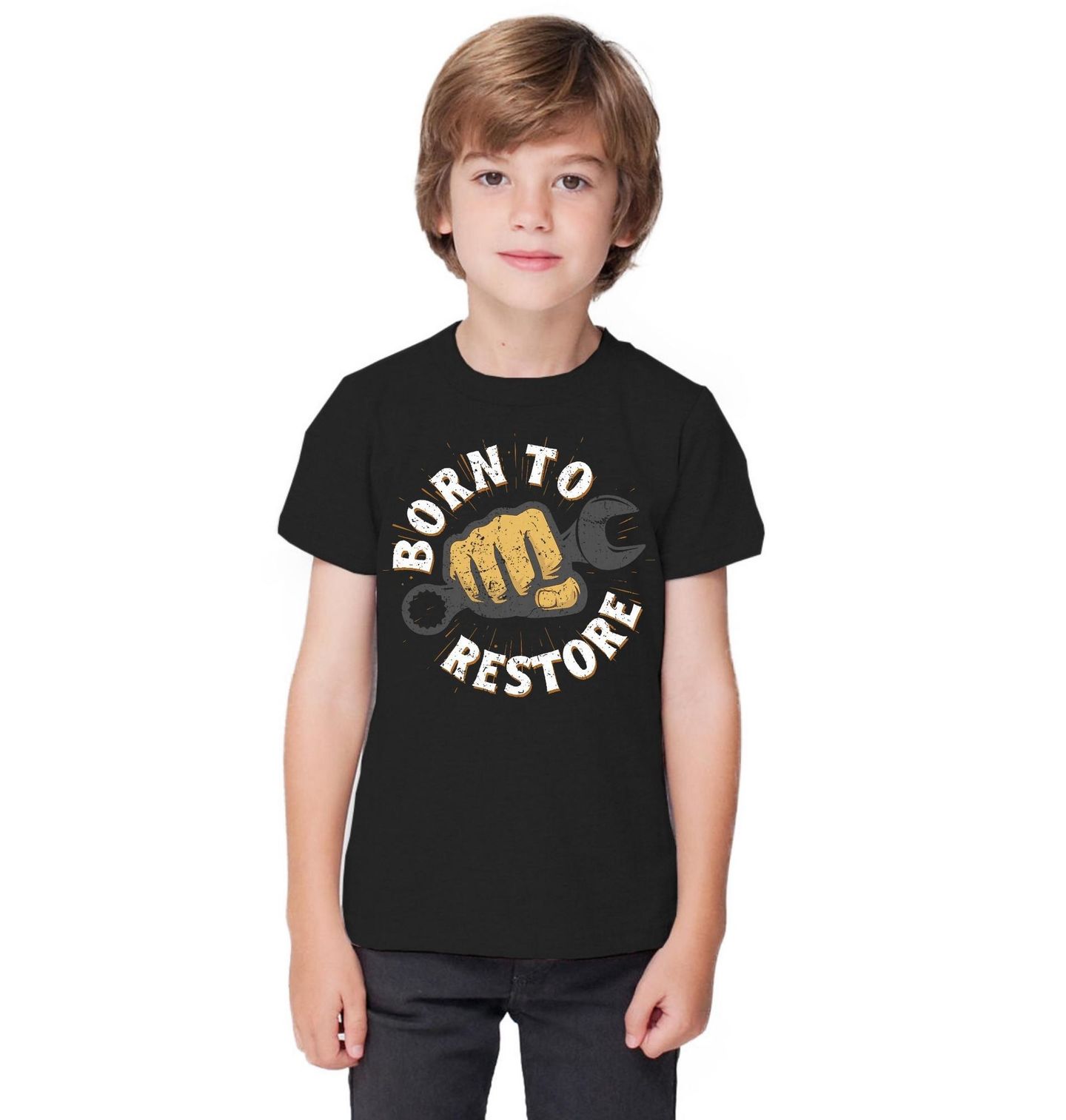 Dětské tričko Síla Opraváře Born to Restore. Stylový design s rukou s klíčem a nápisem „Born to Restore“ oslavuje všechny, kteří rádi opravují a tvoří. Překlad textu: „Narozen k opravám“. Ideální motiv pro kutily, mechaniky a všechny, kdo milují práci rukama a dávají věcem nový život.