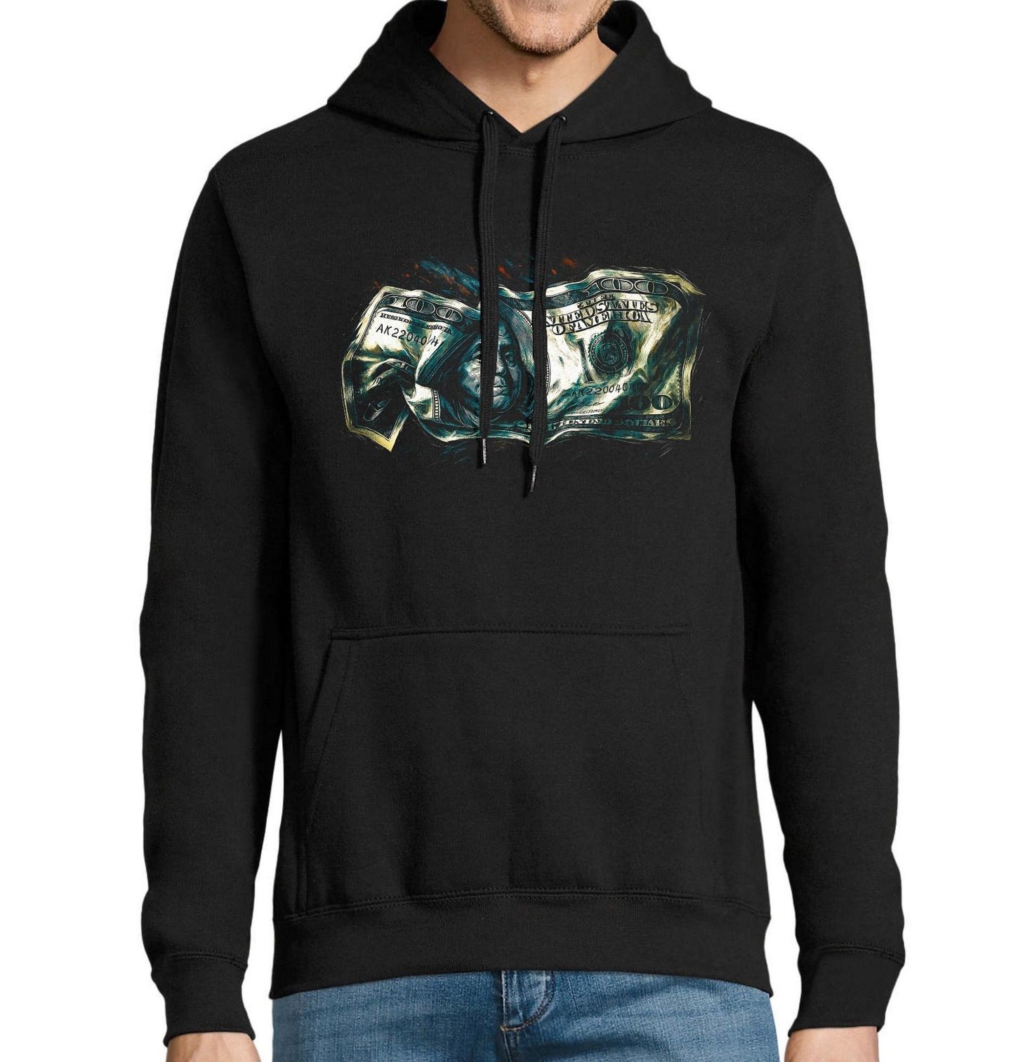 Pánská mikina Síla Peněz 100 dolarů. Originální design zachycuje pokroucené a zničené peníze, které symbolizují pomíjivost hodnot a sílu materiálního světa. Na motivu je vyobrazen Benjamin Franklin, historická osobnost známá z americké stodolarové bankovky, jehož tvář se zde deformuje spolu s celým symbolem bohatství. Tento výrazný motiv propojuje temnou estetiku s hlubší myšlenkou – jakou cenu mají peníze v dnešní době a co všechno jsou lidé ochotni obětovat.