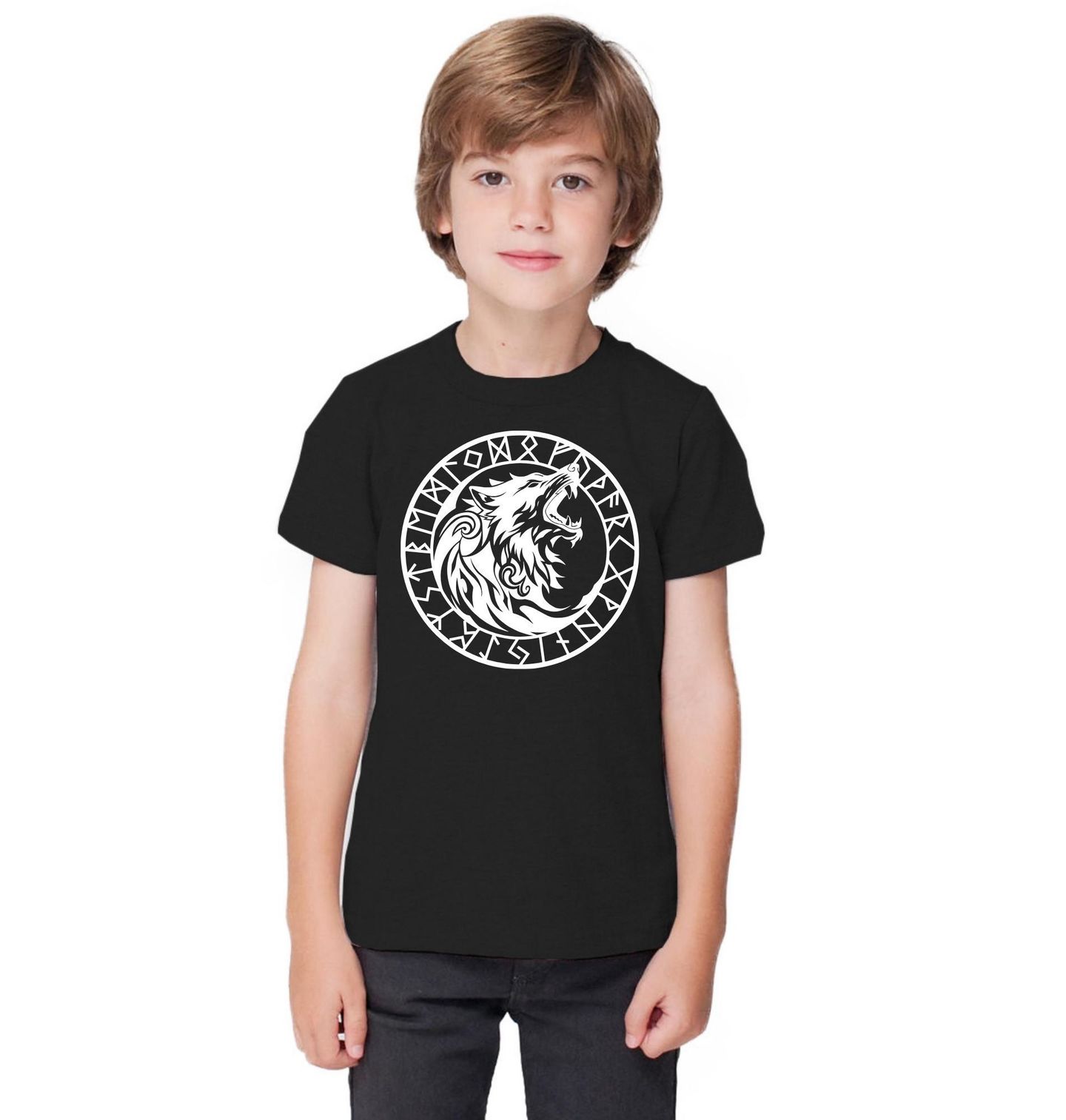 Dětské tričko Síla Severského Vlka. Tento mystický design zobrazuje siluetu vlka obklopenou kruhem staroseverských run. Vlci v severské mytologii symbolizují sílu, odvahu a divokost přírody, zatímco runy představují staré tajemství a magii Vikingů.
