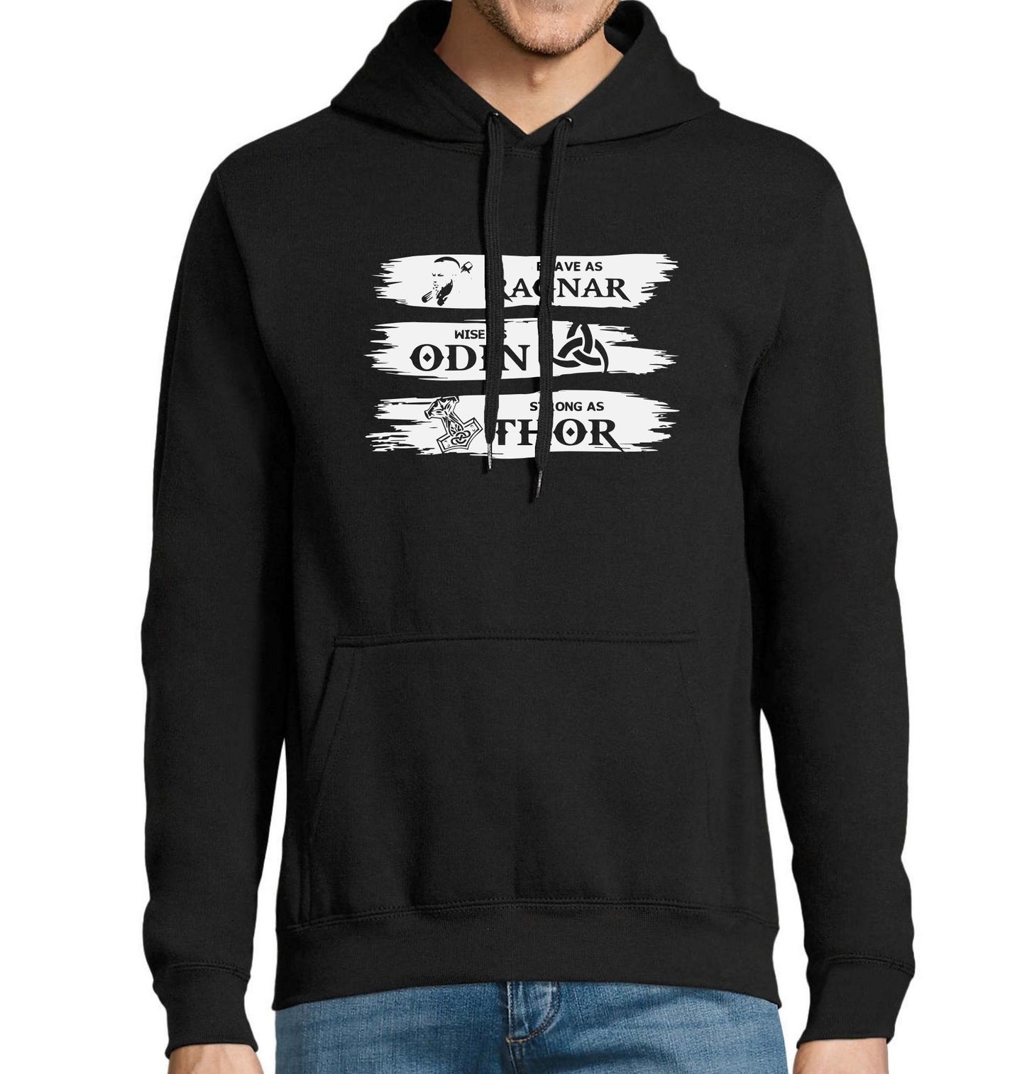 Pánská mikina Síla Vikingů Ragnar, Odin, Thor. "Brave as Ragnar, Wise as Odin, Strong as Thor - "Buď odvážný jako Ragnar, moudrý jako Odin a silný jako Thor. Originální motiv pro každého fanouška nordické kultury, seriálů i mytologie. Ideální pro ty, kdo v sobě nosí srdce bojovníka a ducha dávných severských válečníků.