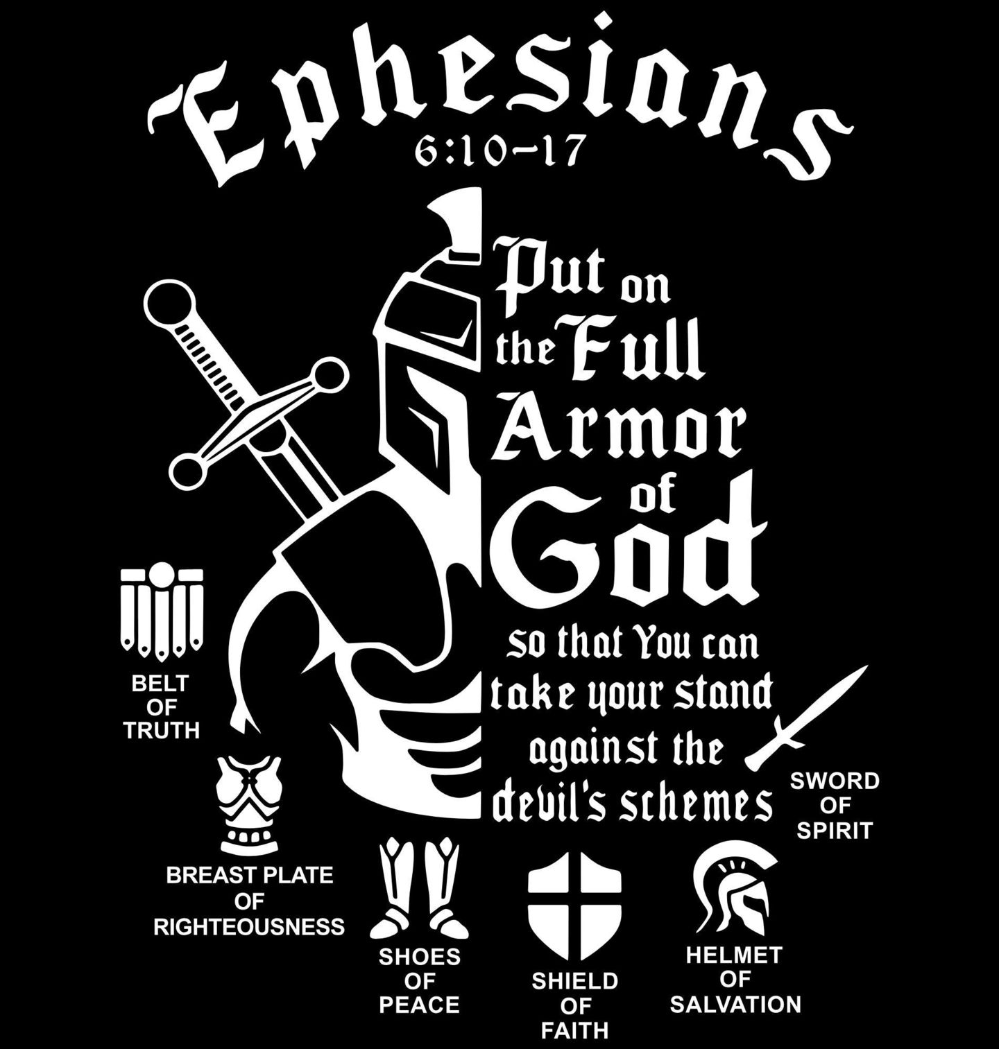 Dámské tričko Síla Víry aneb Plná Zbroj Templáře. Silný křesťanský design inspirovaný veršem Efezským 6:10–17, který vyzývá: „Oblečte plnou Boží zbroj, abyste mohli obstát proti ďáblovým úkladům.“ Motiv obsahuje symboly jako pás pravdy, pancíř spravedlnosti, boty pokoje, štít víry, přilbu spasení a meč templáře.