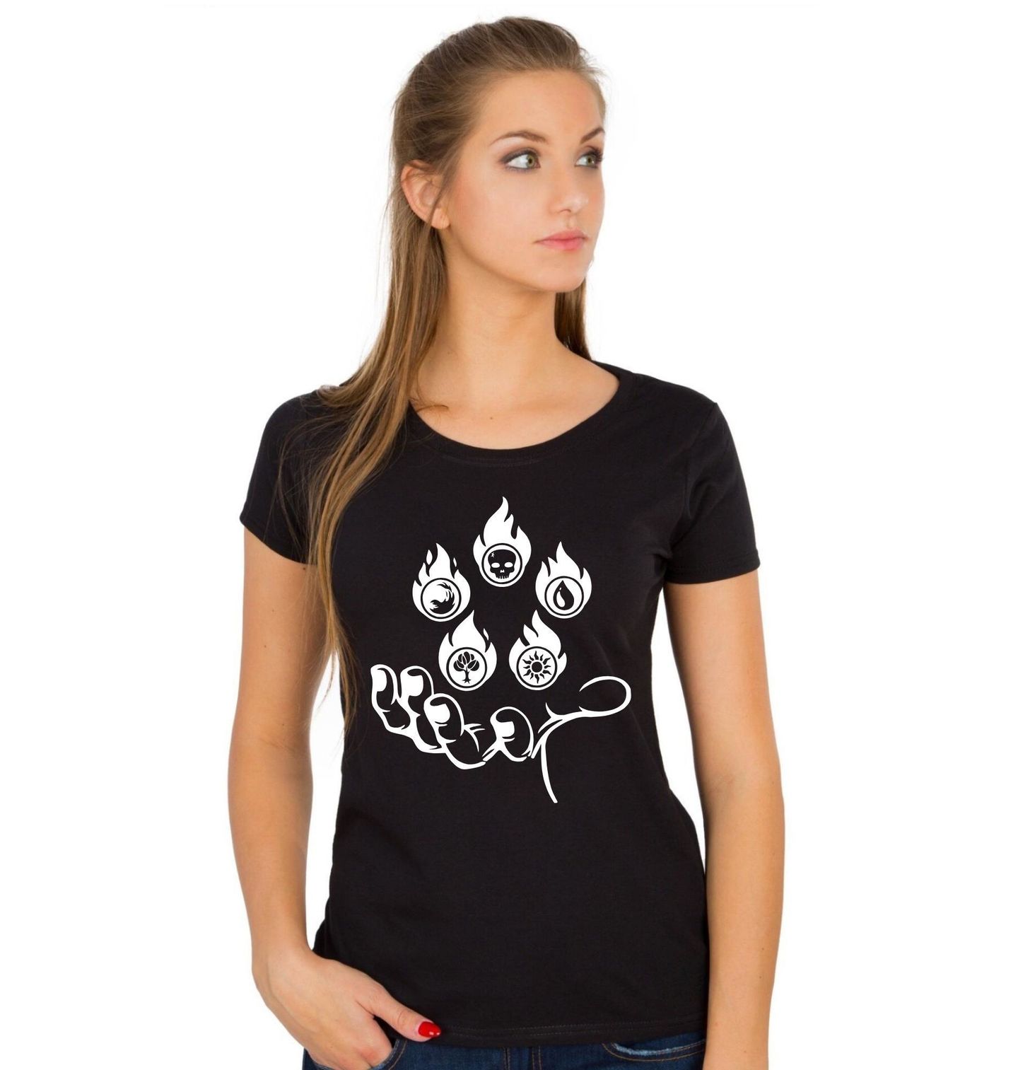 Dámské tričko Magic: The Gathering Síla Živlů. Symbolika pěti živlů – oheň, voda, příroda, slunce a temnota – zobrazená ve stylizovaných plamenech. Magic: The Gathering (zkráceně MTG) je sběratelská karetní hra. V roce 1993 ji vydala firma Wizards of the Coast v USA a rychle se rozšířila do většiny světa.